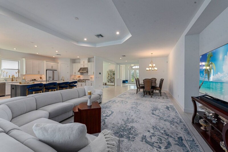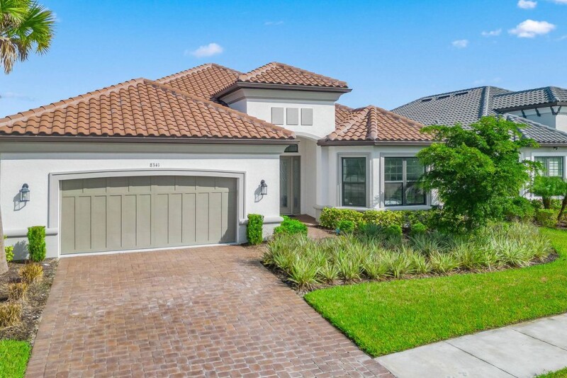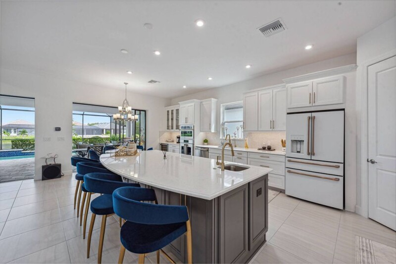This stunning like-new modern single-family pool home, built in 2022, is in the highly sought-after Esplanade at Hacienda Lakes. With tranquil water views, this 2,929-square-foot popular Pallazio residence offers three bedrooms plus a den, three full baths and a two-car garage. Designed with a dramatic double door entry into a massive great room that opens up to the outside, this home ideally blends comfort with sophisticated style. Inside, you'll find extensive custom details and a thoughtfully designed split-bedroom layout with 10-foot ceilings, elegant tile flooring and recessed lighting. Natural light floods the living areas through abundant windows. The kitchen is a chef's dream, featuring an extended layout with shaker-style cabinets with under-cabinet lighting, a tile backsplash, quartz countertops, exquisite fixtures, walk-in pantry and a large island with a prep sink with storage. The upgraded appliances include a gas cooktop with a warming tray and hood, double-wall oven, microwave, French door refrigerator, dishwasher and a wine refrigerator. The heart of the home is the expansive great room, with upgraded pocket sliders on both sides that open to the extended lanai, offering seamless indoor-outdoor living. The screened lanai, with brick pavers, boasts a heated pool and spa with a waterfall feature, and a large covered outdoor living area for ultimate relaxation. Additionally, plumbing and electrical are installed for a future outdoor kitchen. The owner's suite is a luxurious retreat with tray ceilings, bay windows and an en-suite bath that includes a huge walk-in shower with multiple shower heads, a rainfall showerhead and benches. The dual sink vanity with a makeup counter and full-width mirror, along with a linen closet and a large walk-in closet with shelving, completes this elegant space. The guest bedrooms are well-appointed, one featuring an adjacent bath with a shower-tub combo and the other offering an en-suite bath with a walk-in shower with glass enclosure. The versatile den can serve as an office or study, providing additional space to suit your needs. Practical features include a central vacuum system, security system, and storm protection with impact windows and shutters. The laundry room offers a utility sink with counter space, ample storage cabinets, and extra-large capacity LG front-load washer and dryer units. The wide brick paver driveway and tile roof enhance the home's exterior appeal, and the exterior bricks, including those on the lanai, were recently sealed for added durability. Residents enjoy a resort lifestyle with access to the clubhouse, planned events, a well-equipped fitness room, a resort-style heated pool and spa, cabanas, a fire pit, tennis and illuminated pickleball courts, a dog park and a playground. Near downtown Naples and Marco Island, this home offers an exceptional lifestyle with easy proximity to beaches, dining, shopping, boating, golf, parks and museums. Furnishings negotiable.
