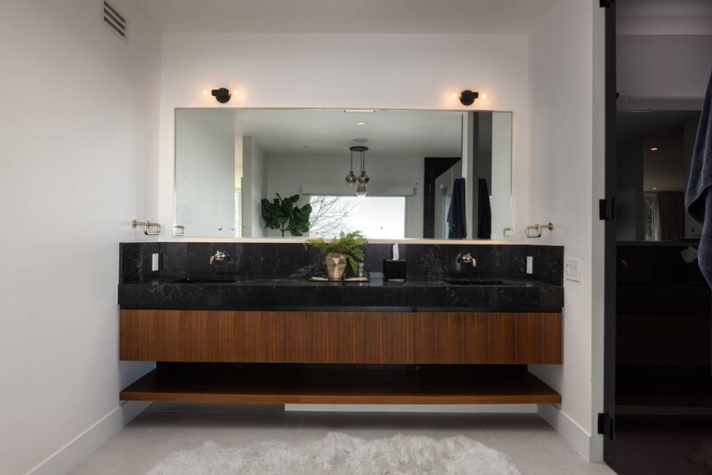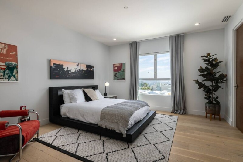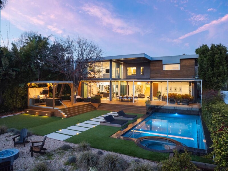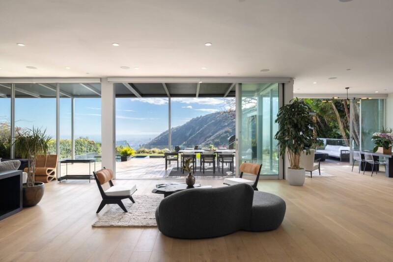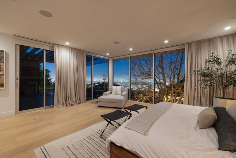Perched in the prestigious Outpost Estates, this gated 5-bedroom, 6-bathroom residence has been completely reimagined with exquisite craftsmanship and high-end finishes. Offering some of the best city views in Los Angeles, this home seamlessly blends modern sophistication with warm, organic design elements. Wide-plank oak flooring flows throughout, complementing the custom cabinetry in the kitchen and bathrooms, which feature a stunning combination of black-stained oak and rich walnut. The chef's kitchen is equipped with a panel-ready Fridge Air refrigerator, two under-counter beverage refrigerators, a Bosch dishwasher, a microwave drawer, and a Bertazzoni range with a custom matching hood. Dekton countertops and backsplashes, Brizo plumbing fixtures, and designer lighting enhance the home's luxurious feel. Anchoring the living space is a striking 60" electric fireplace with a Dekton surround, creating an inviting ambiance. The primary suite is accompanied by a versatile adjacent room designed as a private gym, complete with a steam shower for the ultimate wellness retreat. Designed for seamless indoor-outdoor living, the backyard has been fully renovated to maximize entertainment and relaxation. A newly refinished pool is surrounded by two gas fire pits and an expansive outdoor pergola. The custom outdoor kitchen is outfitted with a Blaze 4-burner grill, an outdoor beverage cooler, premium Danver cabinetry, and Dekton countertops with a steel backsplash. The exterior of the home is wrapped in luxurious Ipe wood siding, with a brand-new backyard awning providing additional shade and comfort. A newly redone roof adds to the home's turnkey appeal. This property offers a rare opportunity to own one of Los Angeles' premier city-view estates, combining privacy, modern luxury, and breathtaking panoramic vistas all in one of the most coveted neighborhoods in the city.