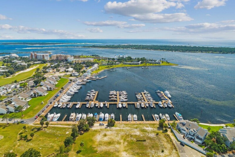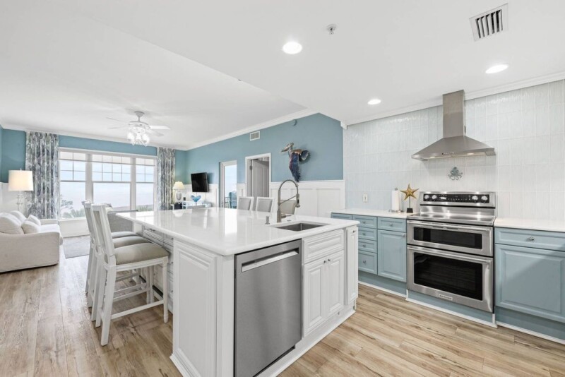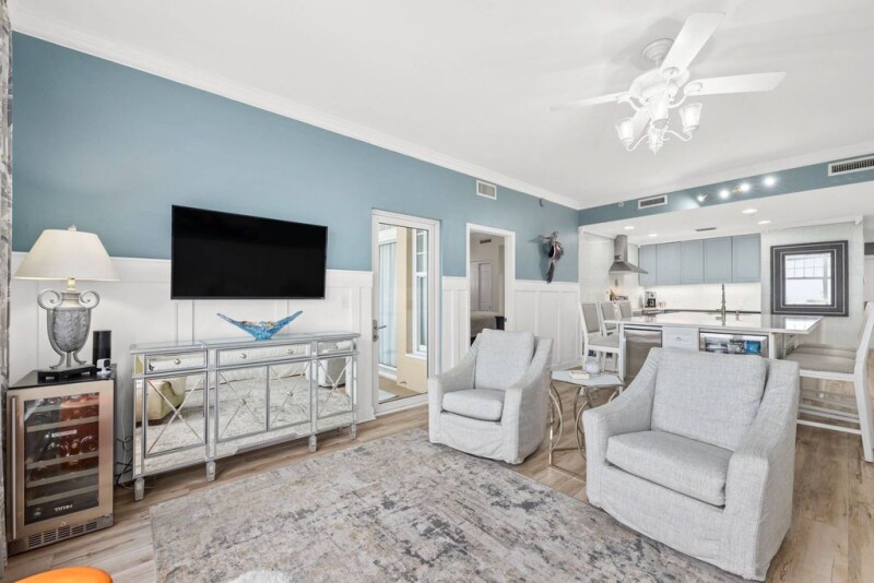 Located at Reflections At Bay Point, this exquisitely furnished condo offers stunning views across St. Andrews Bay, the Gulf of Mexico and the inlet. Fully updated and beautifully appointed, this two-bedroom unit boasts professional decor and refined furnishings by Tassels Interiors. Relax in the impeccably presented sitting area, where luxury furnishings and custom draperies complement the soft blue decor. Natural light streams through picture windows with retractable sunshades, leading to an adjoining balcony where you can enjoy the view of passing boats and the peaceful sounds of the water. Enjoy views of the signature 5th hole on the renowned Jack Nicklaus golf course. The gourmet kitchen features an oversized 5’ x 9’ island with an ice machine and under-counter microwave, along with ample storage in 11 drawers. Quartz countertops extend to create a dining area for cocktails and conversation. Cooks will appreciate the pull-out spice rack, custom cookbook rack, ventless hood, and double ovens, all set against gorgeous soft blue cabinetry and high-end stainless appliances. The stunning primary bedroom boasts custom floor-to-ceiling drapes, a millwork feature wall and elegant crown molding. The adjoining bathroom features upgraded lighting and a spacious walk-in shower. The guest suite continues to impress with its own distinctive millwork feature wall and a stylish bathroom featuring a marble vanity and walk-in glass shower. Situated in the rental-friendly Reflections community within Bay Point, residents have access to amenities such as a hot tub, fitness center, outdoor kitchen, and two pools (one heated), as well as private beach access. Bay Point itself is an exclusive, golf-cart-friendly neighborhood, with Point South Marina just a short stroll away.