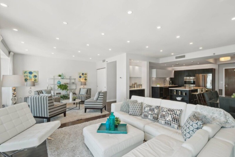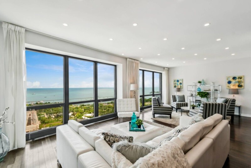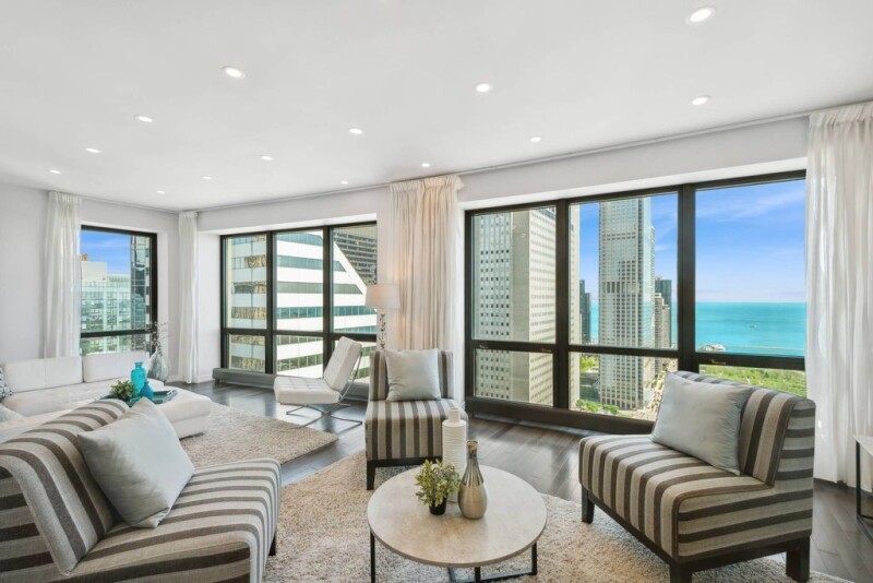 First-class renovation with magnificent views of Lake Michigan, Millennium Park, The Bean and the city skyline from floor-to-ceiling windows - every room faces east! This one-of-a-kind home was renovated with a top-of-the-line design and finishes. The 3rd bedroom was opened up to the living areas and can easily be converted back to a bedroom. Beautiful oak wood floors, recessed LED lighting, custom ceiling lights and surround sound throughout the home. The spacious living-dining area includes custom designed dry bar area. Open chef's kitchen features Copatlife Italian cabinets with lift doors on upper cabinets, quartz countertop with single bowl stainless steel undermount sink and luxury appliances (Viking refrigerator-freezer, oven, cooktop, microwave and dishwasher). Stylish island has breakfast bar seating for 4 people and additional cabinetry. Expansive master suite has amazing views of Lake Michigan and Millennium Park, and a custom walk-in closet. Beautiful marble master bathroom with Pedini floating lacquer cabinets, dual Vttinox stainless steel sinks and countertop, whirlpool bathtub and separate marble shower. Guest bedroom has custom closet interior and overlooks the private balcony. Guest bathroom has Pedini floating lacquer cabinet with quartz countertops, marble shower and porcelain tile floor in a beautiful herringbone pattern. Powder room has Pedini floating lacquer cabinet and custom lighting. Laundry closet with side-by-side washer/dryer. Full-amenity luxury condo building with 24-hour door staff, on-site management, party room, conference room, sauna, indoor pool, fitness center, 3 outdoor terraces, dog run, dry cleaner, receiving room, storage locker, Pedway access and more! Amazing location in walking distance to lakefront, Millennium Park, Grant Park, Chicago Theater, Art Institute Museum, Orchestra Hall, Lyric Opera, shopping, restaurants, transportation and more! 1 deeded parking space 8-40 available at $50K.