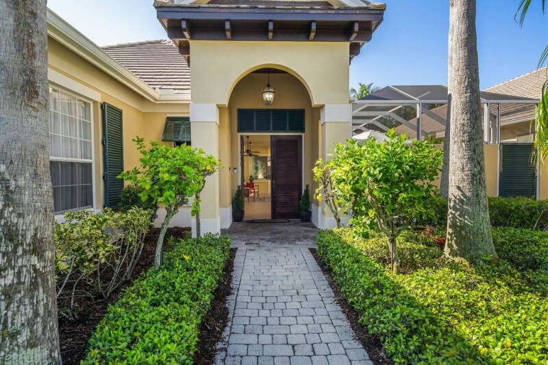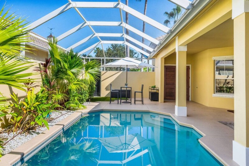 This charming 3-bedroom, 3.5 bath, West Indies-style courtyard pool home exudes a bright, airy ambiance with an open floor plan and elegant wood plank tile flooring throughout the living areas and bedrooms. High ceilings enhance the spacious feel, while glass sliders seamlessly blend indoor with outdoor living, leading to a private tropical pool oasis and covered porch, perfect for relaxing or entertaining. The expansive owner's suite offers a serene sitting area, access to a back porch overlooking green space, a custom walk-in closet, and a beautifully renovated bath with quartz countertops. Each guest bedroom features its own ensuite bath and custom closets for comfort and privacy. The kitchen boasts white marble quartz countertops, a newer refrigerator and dishwasher. Recent upgrades, Sept. 2024, include a new AC system, water heater, and pool pump. Nestled in The Seasons, residents enjoy a clubhouse, resort-style pool, fitness center, tennis, pickleball, croquet, and a short stroll to the beach.