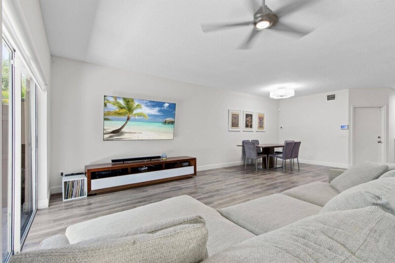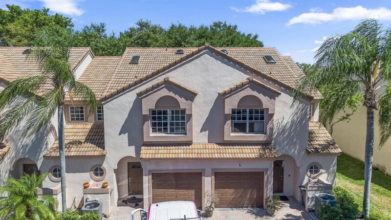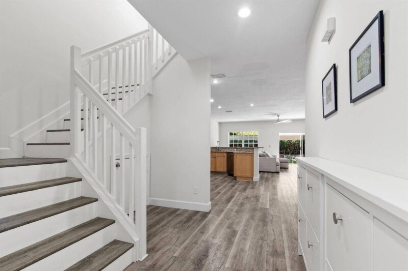 Discover this beautifully updated 3-bedroom, 2.5-bath townhome in the highly sought-after gated community of Coral Lake. This rare find offers an open-concept layout with soaring vaulted ceilings and skylights, filling the space with abundant natural light. Recently renovated, the home features brand-new flooring throughout, fresh paint, new baseboards, and smooth ceilings--no popcorn here! The thoughtfully designed open kitchen boasts solid wood 42'' cabinets, granite countertops, a full granite backsplash, a raised counter bar, and custom cabinetry, seamlessly blending style and functionality. Stainless steel appliances complement the space, while the adjacent separate laundry room adds extra convenience.Upstairs, the double-door entry leads to a spacious primary suite with an.