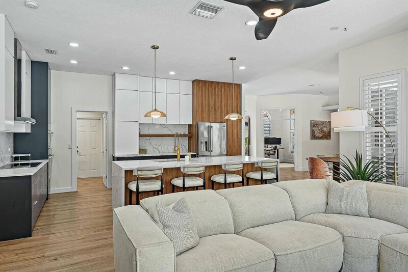 Nestled on 1.55 acres of pristine land, this stunningly renovated Jupiter Farms estate offers modern elegance, privacy, and top-tier upgrades throughout. A meticulous renovation has transformed this home, featuring high-end designer lighting, wide plank wood-like flooring, and solid-core doors, for a seamless blend of style and sophistication. At the heart of the home, the expansive chef's kitchen is designed to impress. A quartz waterfall island serves as the focal point, while premium finishes and an open layout create a perfect space for entertaining. Oversized windows and sliding doors allow abundant natural light and offer breathtaking views of the sparkling saltwater pool and lush surroundings.