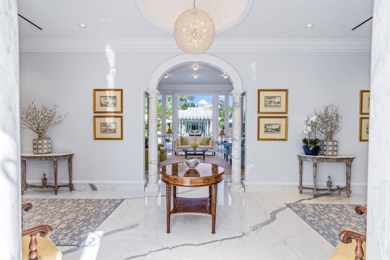 Regally elevated at 16'+ on over half acre this Palm Beach Palladian residence showcases quintessential architecture set within beautifully landscaped pool gardens. Featuring hallmarks such as symmetry and proportion, the home offers very generous room sizes. ceiling heights, floor to ceiling windows and doors, an abundance of natural light from the many skylights throughout the home. Formal living and dining rooms are balanced with warm, inviting family gathering areas and spacious guest suites and quiet, lovely views from every window. Perfectly manicured landscaping envelopes the home and the cabana/guest suite. 3-Car attached garage, full house generator, and plenty of driveway parking completes this spectacular offering.