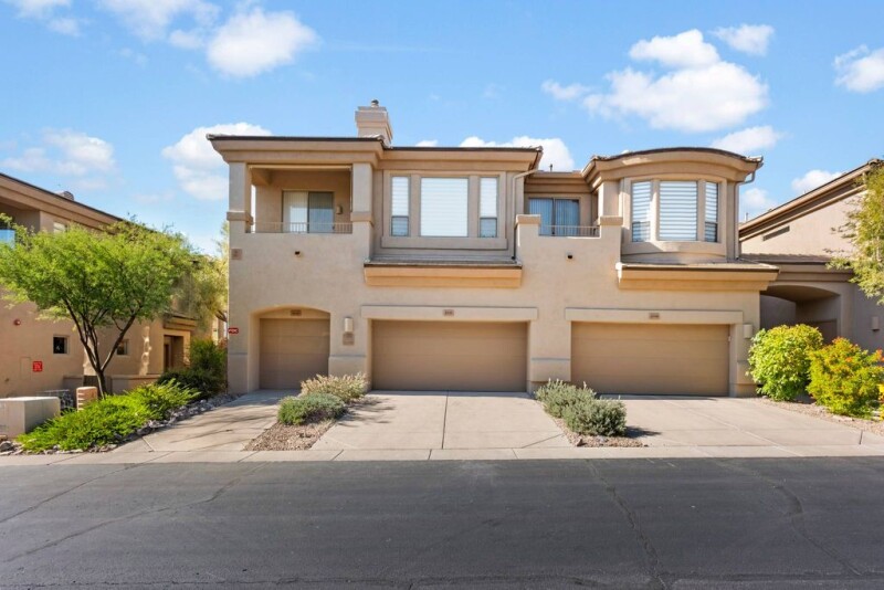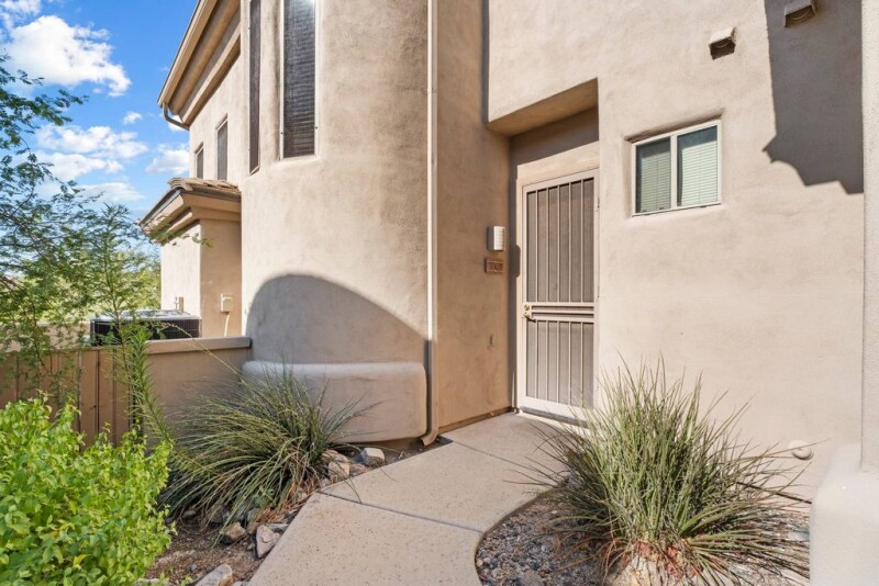 Prime elevated location within the complex, this 2-story end-unit townhome boasts picturesque, views of lush landscaping. An inviting great room, complete with a cozy fireplace, flows effortlessly into the dining area & sliding doors open to a private patio, ideal for outdoor relaxation. On the lower level, a versatile office space can double as an additional sleeping area. The primary bedroom offers a private balcony overlooking the beautifully curated desert landscape, while an en-suite guest room provides comfort and privacy. The community offers exceptional amenities, including a well-maintained pool, spa, & workout facility, along with access to the renowned McDowell Mountain Ranch community amenities. Cachet is conveniently located close to the 101 and popular dining spots.