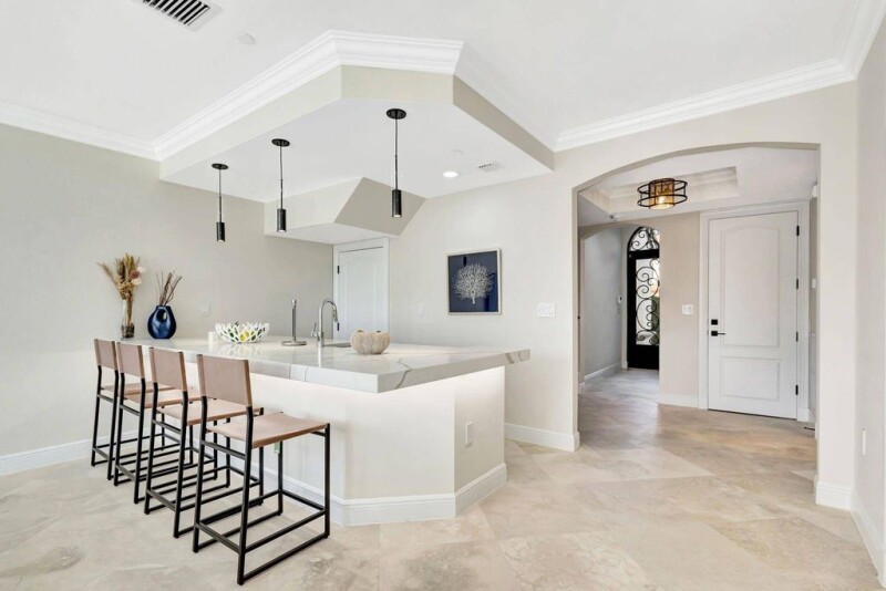 45' Slip Sold Separately w/unit! Indulge in Luxury & Sophistication w/This Fully Furnished Decorator Designed 3-Story Waterfront Townhouse Perfectly Situated in Exclusive Gated Community of Marina Gardens on Soverel Harbour Marina. This Meticulously Remodeled Home Offers 3 BR, 4 BA, 2 Car Garage, Private Elevator & a Versatile 1st Floor Bonus Room Complete w/Oversized Quartz Wet Bar Featuring Under Counter Lighting, Refrigerator, & Full Bath. Elegant Honed Saturnia Marble Floors,Plantation Shutters & Impact Windows & Doors Throughout, While Sleek Panel Glass w/Metal Railings Accentuate Staircase. Gourmet Kitchen Boasts a 5- Burner Natural Gas Cooktop, Expansive Island, Appliance Garage, Pantry Cabinets w/Pullout Shelves. Wine Rm/Din Rm Features a Stunning Built-In Wine Wall w/Sub-Zero..