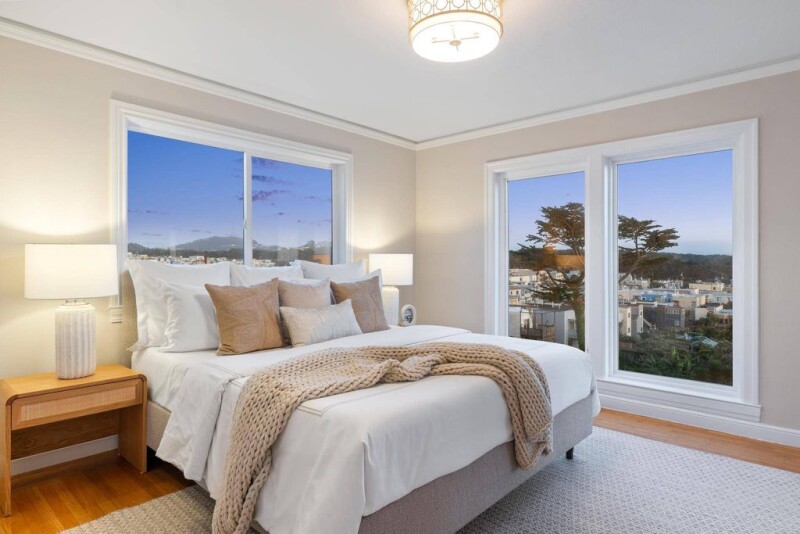 Magnificent ocean and GG park views, 3 bright levels of living space, fully detached French Provincial home with 2 foyers, 5BR, 2BA, living room, dining room, kitchen, breakfast room, flex space, garage, and massive deck overlooking a spacious back yard. Gorgeous living room features a fireplace, arched window, crown molding, and hard wood floors, alongside a modern kitchen with quartz countertops, stainless steel appliances, and wood panel ceiling, adjacent to the dining room illuminated by a wall of windows, connected to a breakfast room with glass doors to the deck and stairs to the yard. Quaint, enclosed, off street, primary entrance opens to the ground level foyer with elegant staircase to the upper levels, access to the large garage with generous storage, washer, dryer, and utility sink, plus a full bathroom, bedroom, and flex room with doors to the yard. Perched in the charming outer Richmond, steps away from the beach, historic parks, restaurants, cafes, bakeries, and shops.