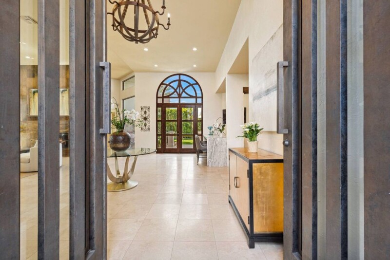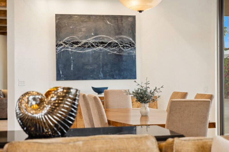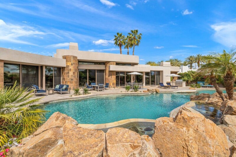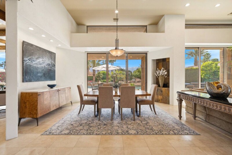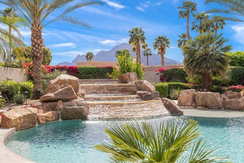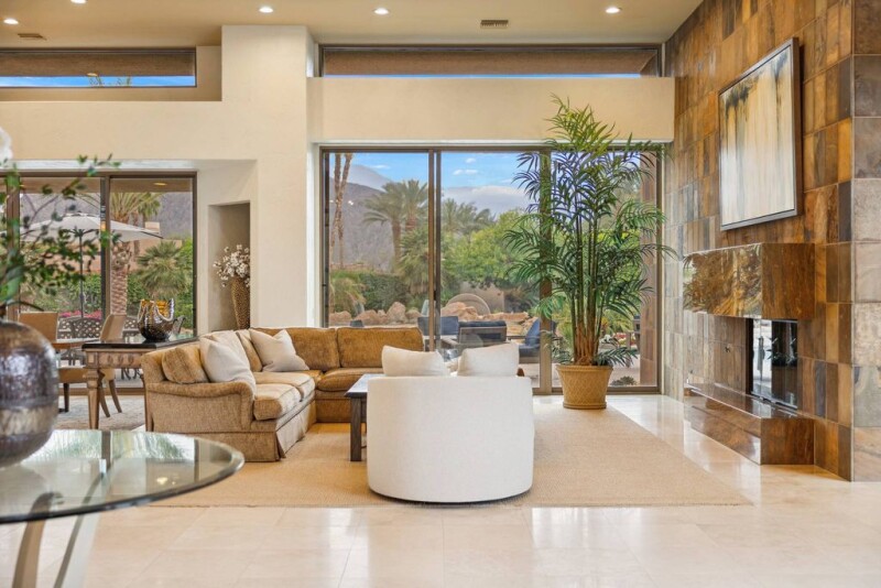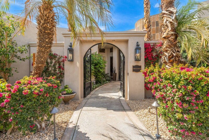 FIRST OPEN HOUSE SUNDAY APRIL 6th 11AM - 2PM. Chez La Fleur is a stunning custom contemporary estate that boasts walls of glass showcasing breathtaking Santa Rosa Mountain views. With soaring ceilings and polished stone floors, the nearly 4,500 sq. ft. layout offers 3 bedrooms + office, 5 bathrooms, and an expansive gourmet chef's kitchen with high-end appliances, large island, custom cabinetry, and wine storage—seamlessly flowing into the family and oversized living and dining rooms. The primary retreat features a spa-like bath, fireplace, huge custom walk-in closet, and private office overlooking the pool and spa. Two additional ensuite bedrooms ensure guest comfort, while a large air-conditioned 3-car garage provides ample storage. Set on a ¾-acre lot, with plenty of space to add a casita, the resort-style backyard offers a custom 75-ft pool, waterfalls, raised spa, lush landscaping, and expansive green space. Dual driveway access from front and back of lot guarantees privacy. Recent upgrades include new kitchen appliances, HVAC systems, pool equipment, water heaters, paint, and automated solar shades. Offered furnished per written inventory, this exceptional home is situated in The Estancias - an exclusive guard-gated enclave of only 49 homes - located near many of La Quinta's finest country clubs, including The La Quinta Country Club, Mountainview Country Club, The Citrus Club, and Rancho La Quinta Country Club.