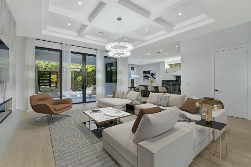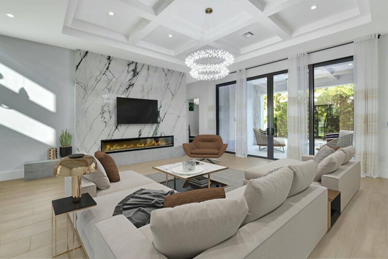 Priced to sell! Move-in ready and perfectly nestled between Mizner Park and 20th Street shopping in the GOLDEN TRIANGLE, this sleek modern home offers both luxury and convenience. The striking open floor plan is anchored by a dramatic fireplace and media wall, with expansive windows framing the sparkling pool and private backyard. A chef's dream, the kitchen showcases top-tier appliances, quartz and porcelain finishes, and custom modern cabinetry. The first-floor primary suite offers direct pool access, a spa-like bath, and a spacious custom walk-in closet. Upstairs, a loft connects three ensuite bedrooms, including a VIP suite. Professionally designed with warm contemporary elegance, this home is elevator-ready and upgraded with custom closets, designer paint, and impact windows!.