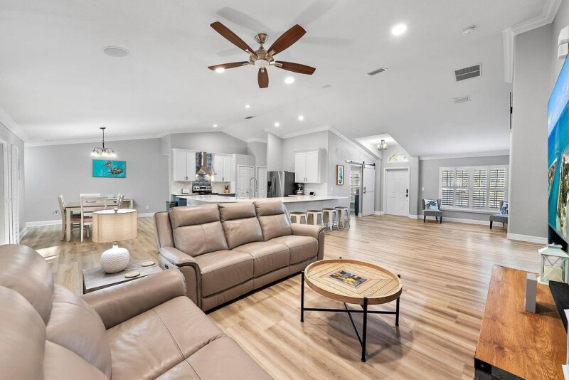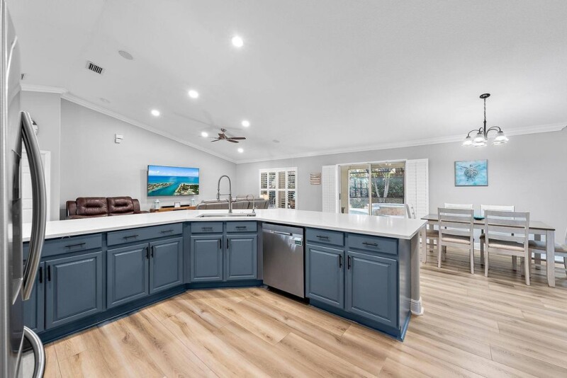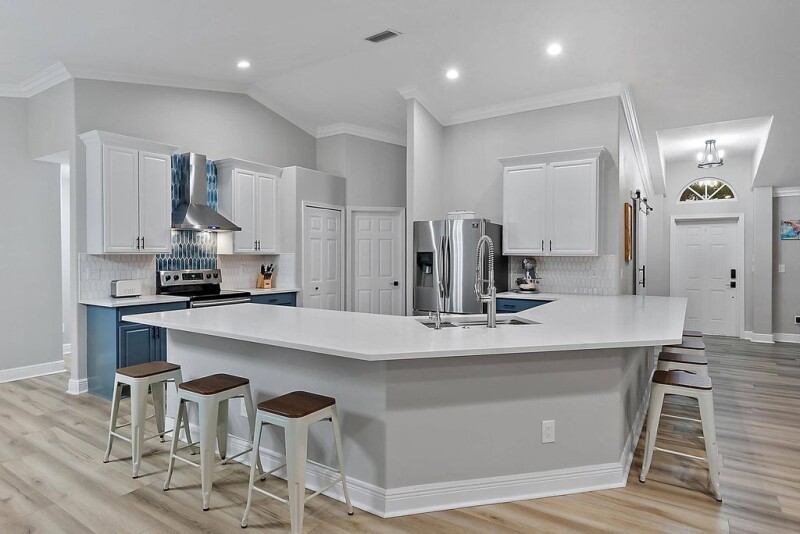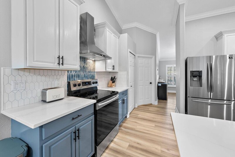 WAIT UNTIL YOU SEE THIS ONE! Tired of the same old cookie-cutter home right on top of your neighbors? This stunning 5-bedroom, 3-bathroom home, situated on a spacious quarter-acre lot, offers plenty of room to live, relax, and entertain! Discover a beautifully renovated space with an open floor plan, perfect for entertaining. Brand new luxury vinyl plank flooring flows throughout the entire home. The gourmet kitchen features sleek Samsung appliances, an oversized stainless sink with a new reverse osmosis water filtration system, and luxurious quartz countertops that go on and on. Adjacent to the kitchen, you'll find a stylish butler's pantry complete with butcher block countertops.