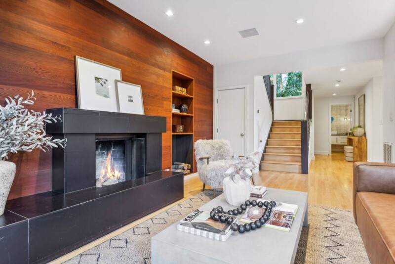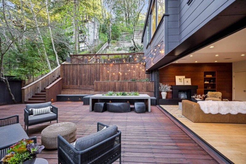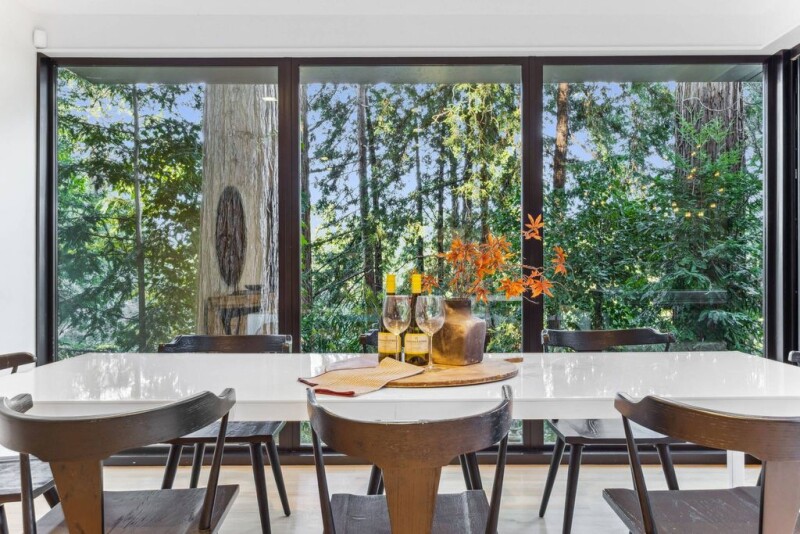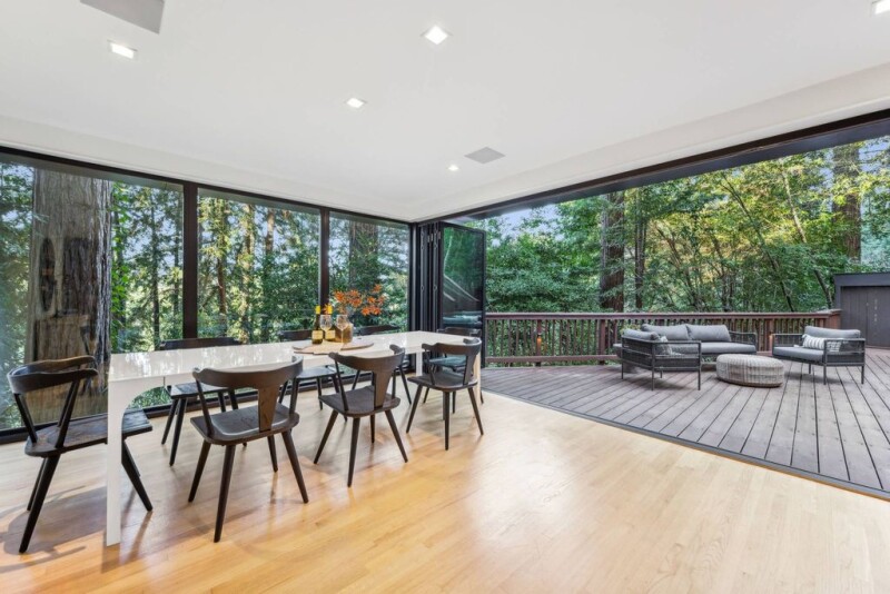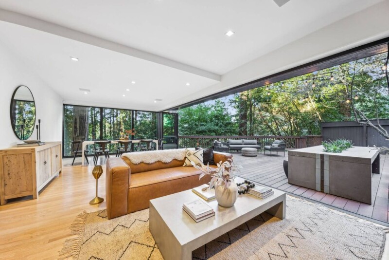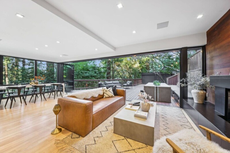Stunning mid-century modern gem in a prime Kentfield location, set back from the street down a magical path. Walls of glass and Nanawall doors create a seamless flow between the interior and huge entertaining deck while highlighting the gorgeous natural surroundings. Beautifully remodeled kitchen and baths feature Heath tile and wallpaper, Miele appliances, Neolith countertops, and Dombracht fixtures. Great floorplan with kitchen/family room combination, living room with fireplace and redwood custom shelving, large dining area, and three generous bedrooms upstairs. Terraced gardens, and huge basement storage. Located just blocks from Rustic Bakery, Woodlands Market, downtown Larkspur, bike paths, and award-winning Kentfield schools. A truly special sanctuary, move right in and enjoy!.