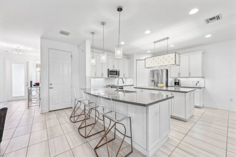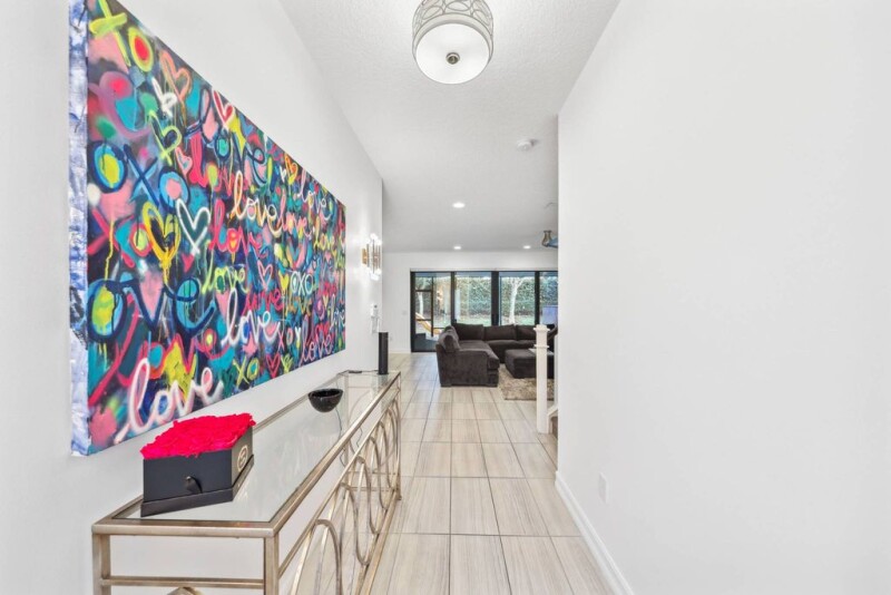 This modern Siena model in Tuscany South features 4 bedrooms, 3 baths, a loft, and an open floor plan with a covered, screened-in patio and 2-car garage. The chef's kitchen boasts upgraded stainless steel appliances, 42'' soft-close cabinets, quartz countertops, a center island, and pendant lighting. A custom-built wall unit enhances the main living space. Modern ceramic plank tile is in the main areas, with upgraded gray carpet in the downstairs bedroom and all upstairs living areas. The master suite offers a coffered ceiling, his-and-hers walk-in closets, dual quartz sinks, a Roman tub, and a walk-in shower. Additional highlights include recessed lighting, a built-out closet, an etched glass front door, plantation shutters, electric blinds, and a paver driveway and patio.