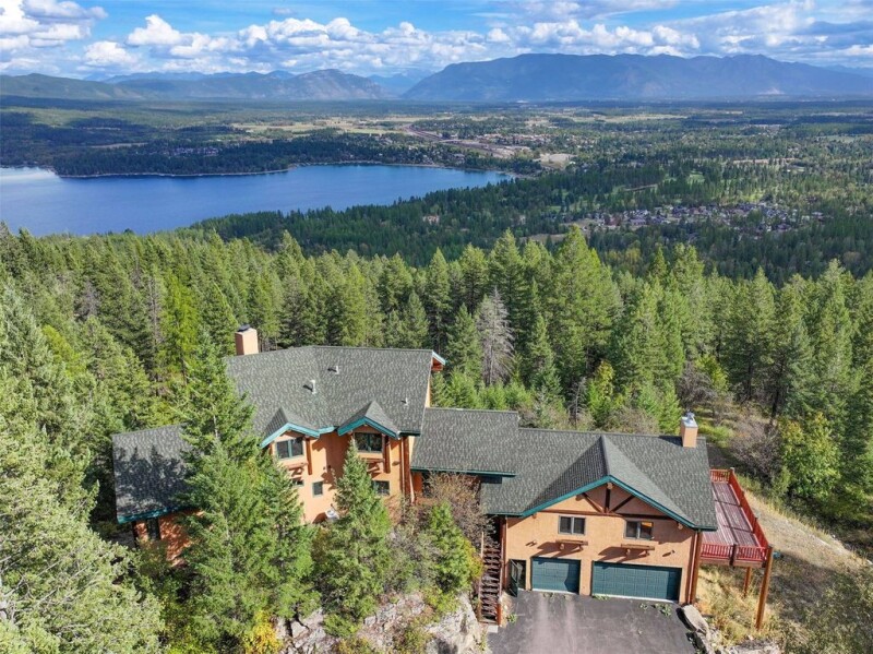 Amazing Whitefish Lake, valley and mountain views from this home nestled amongst the forest and rock outcroppings in Wolftail Pines. End of the road privacy with this 10 acres that is only 4 miles from downtown Whitefish and Whitefish Lake. The home is multi level and provides private living areas throughout the home. The main level has the primary suite, living room with river rock fireplace, dining room, kitchen and powder room. A hot tub sits on the wrap around deck. Upper level has 2 bedrooms and a bath. The family room on the southern wing has a wet bar, bath, and large deck. The lower level has a generously sized bedroom, bath, family room with wood stove and mechanical room. Additional closets throughout the home provide ample storage. Attached oversized triple garage off the paved driveway.