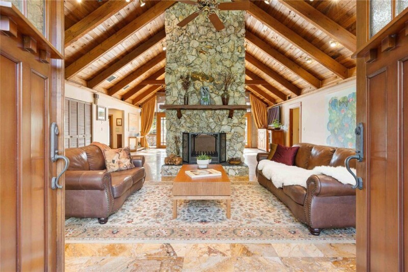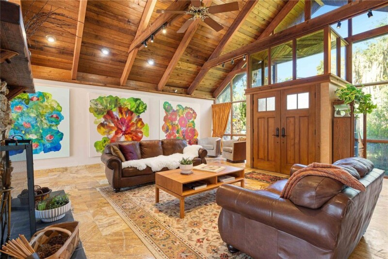 This luxurious cedar and stone RIVERFRONT lodge located on the St. Lucie River will capture your heart! Surrounded by moss draped oaks, this 3,667 square foot architectural masterpiece sits on a .99 acre professionally landscaped lot. A secluded 40 foot long pool and spa await your pleasure. Follow the path to the river and your own boat DOCK with deepwater access & only one high fixed bridge. Upon entering, view soaring cedar ceilings & an immense, double-sided stone fireplace. Polished travertine floors lead you to the pool through the enormous glass wall before you. Finding the home of your dreams, continue through the 4 bedrooms, dining room and a gourmet kitchen large enough to handle the best of parties you are dreaming of having in the future. *NEW: bathroom Renovations*.