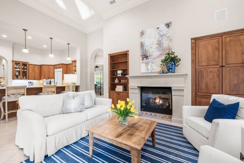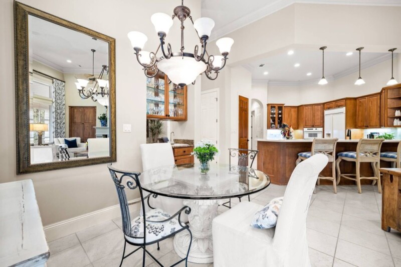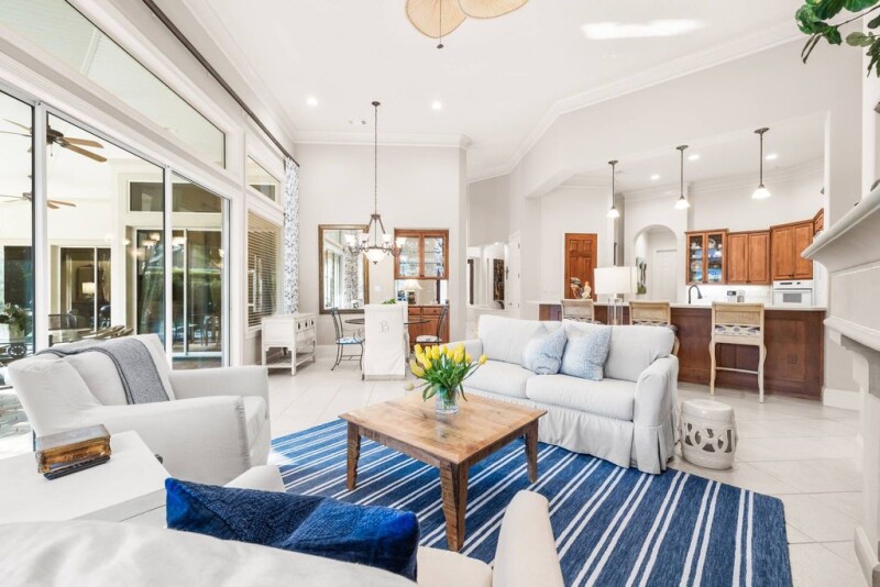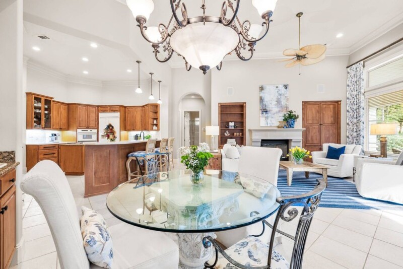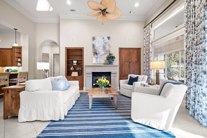 This exquisite three bedroom home with an additional office in the prestigious Stonebridge neighborhood of Kelly Plantation sits on a sprawling .58-acre corner lot, offering privacy, charm and exceptional amenities. With its stately stucco exterior, tile roof and dedicated golf cart garage, the property exudes sophistication while providing ample space to add a pool or a semi-circular driveway for added convenience. Designed for both relaxed living and elegant entertaining, the interior features warm and inviting family spaces alongside a grand formal living and dining area. The kitchen is well-appointed with a spacious island, raised breakfast bar and KitchenAid appliances, all complemented by a neutral color palette that allows for effortless customization. Multistage crown molding, ceiling treatments and a deluxe lighting package add to the home's refined character. A highlight of the property is the expansive 802-square-foot screened porch, which along with the interior spaces have a wired sound system and are perfect for enjoying Florida's beautiful climate year-round. Additional features include tile flooring, plush carpeted bedrooms, a paver patio and a central vacuum system. Located within the gates of Kelly Plantation, residents enjoy championship golf, tennis, pickleball, a community pool, miles of walking trails and a private dock for paddleboarding and kayaking. The owners' clubhouse was recently remodeled, and this furnished space with outdoor grills is available for owners to reserve for private parties. Next door you will also find a fitness room and a separate yoga/pilates studio. Sports courts and 24-hour security complete this unparalleled lifestyle, with the beach, Whole Foods, Fresh Market and Destin Commons just a short golf cart ride away. Meticulously maintained by its current owner for 20 years, this home offers an extraordinary opportunity to experience luxury living in one of Destin's most sought-after communities.