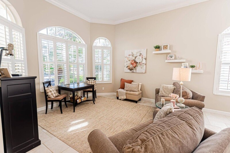 Luxury Living in PGA Village! This impressive two-story, 4/4 pool home with an office is situated on the 14th hole of the Wannamaker Course. Main level boasts an open-concept design with crown molding, separate family, living, & dining room, breakfast nook, & spacious primary suite. The kitchen features granite countertops, stainless steel appliances, and 42'' cabinetry. Tile and wood flooring flow throughout the home, complemented by plantation shutters. A double-door office provides a private workspace on main floor. Upstairs, features 2 spacious bedrooms, bathroom, & large bonus room with a walk-in closet, en-suite bath, and private balcony. Step outside to a beautifully designed screened-in pool & covered lanai. The home includes an oversized driveway & side-entry garage. HOA dues.