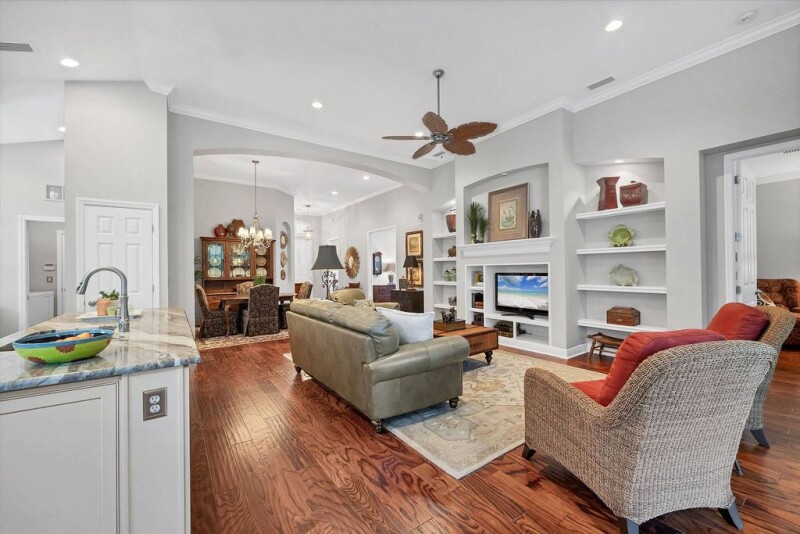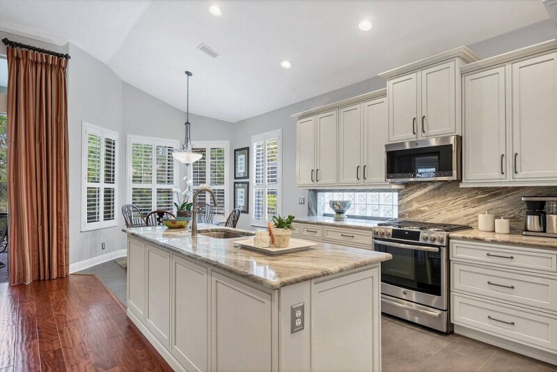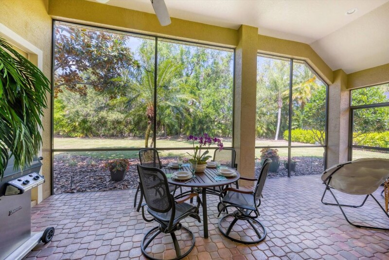 Within the active community of The Country Club in Lakewood Ranch is a welcoming home with a cottage feel with many upgrades that are showroom quality and move-in ready. On a cul-de-sac road in a quiet neighborhood of Orchid Island, our residence features 12- and 10-foot ceilings, crown molding, engineered hickory wood floors, built-in cabinetry in the living room and plantation shutters throughout. Newer renovations include the kitchen and primary bath. The kitchen renovation in 2019 included porcelain tile floor, solid wood cabinets, lovely high-end granite, built-in desk area and pantry closets. The primary bath 2022 has a soaking tub, separate walk-in shower, double sink vanity, water closet and porcelain tile floor. The main living space is open with high ceilings, lovely detailing and sliding glass doors that stack, opening up to the screened-in porch. The central space includes a formal dining alcove, kitchen, breakfast nook and living room. Between the front and back bedrooms is a sunny den/office with double pocket doors. The front guest room has a bay window and adjacent hall bath. The main bedroom enjoys direct access to the screened porch with garden, lawn and tree views. It also offers a large walk-in closet. This home is in impeccable condition and lovingly maintained. The community pool is several houses down the street. The community maintains the pool and the lawn care. The Lakewood Ranch Country Club offers an abundance of activities to complement your lifestyle dreams. Have peace of mind with a quality purchase and enjoy the excitement of your next chapter.