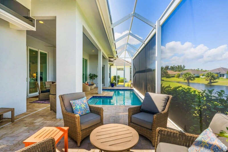 This home is Florida Luxury Resort living at its finest. This is a GHO home built in 2022 featuring 12 foot Ceilings, Tray Ceilings. Gourmet Kitchen, Quartz Countertops, nice size island, lots of cabinets. This is a three bedroom, three full bath home with a office. The pool patio has the panoramic screened in patio, the pool floor is travertine. The pool overlooks the lake. The home has two car garage and concrete roof built to the latest hurricane codes. The community features a nice club house with a gym, reception area and a large pool. The community has one or two private docks availabel.