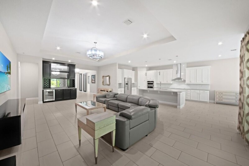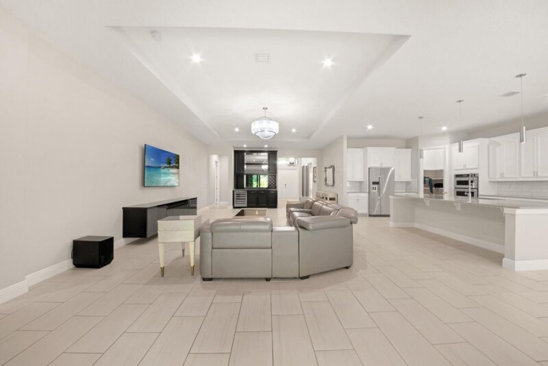 Welcome to this exquisite 4-bedroom, 3.5-bathroom single-story home, designed to impress with every detail. Nestled on a private lot backing to a serene preserve with no rear neighbors, this residence offers the ultimate in privacy, comfort, and contemporary luxury. Upon entering the inviting foyer, you'll be captivated by the open floorplan featuring neutral flooring, coffered ceilings, and custom lighting. The home's smart features include a Ring system and advanced smart home technology. Impact windows, a whole-house Generac generator, and a water softener provide security and convenience. The dream kitchen is a culinary masterpiece with classic white cabinetry, a tiled backsplash, stainless steel appliances, a wall oven, a walk-in pantry, pendant lighting, and a snack bar.