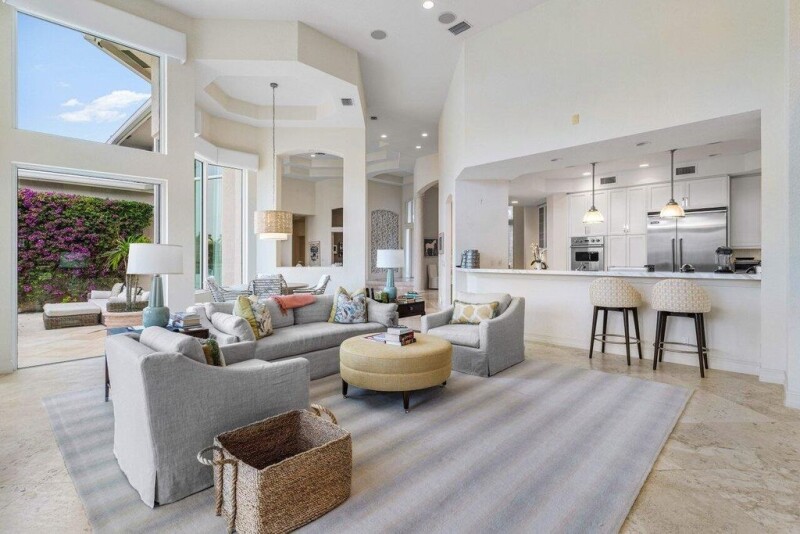 FULLY TRANSFERABLE GOLF MEMBERSHIP AVAILABLE FOR PREMIUM ($400K)! Stunning lakefront 5BD 6.BA (plus office) located in Windsor Bay of Woodfield Country Club. Windows from floor to vaulted ceilings flood the home with natural light, offering breathtaking views from every primary living space. The open living area boasts a cozy fireplace, while striking columns add character to the spacious dining area. The kitchen blends function and style with Viking stainless steel appliances, a gas stove, white cabinetry, and marble countertops, contrasted by a butcher block island perfect for preparing and presenting dishes. A light blue tile backsplash adds the perfect pop of color to the space, and an adjacent kitchenette with a wine refrigerator provides extra storage.