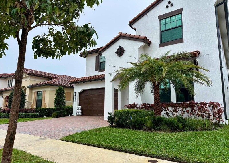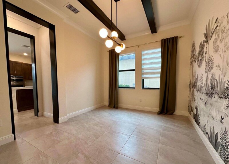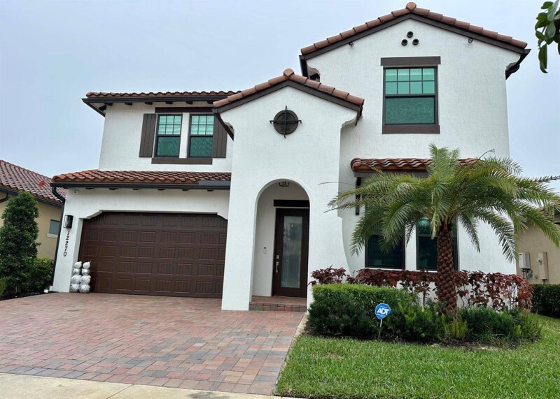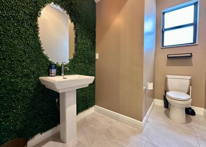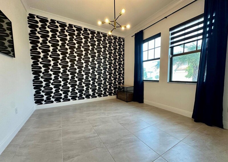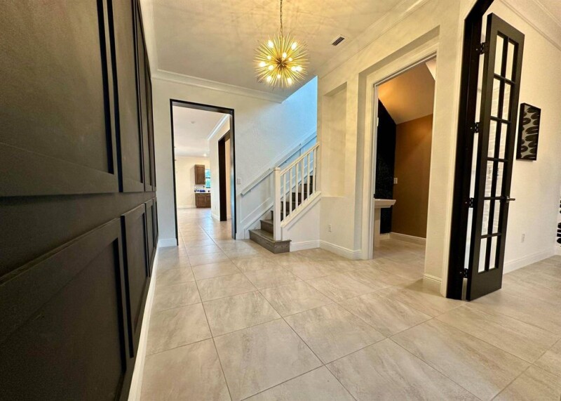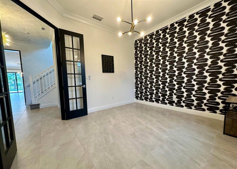Stunning 4-bedroom, 3.5-bath home with a bonus room, nestled on a serene waterfront lot, the property boasts a heated swimming pool/spa, maintenance-free AstroTurf surrounded by lush, updated landscaping.Exterior features include security cameras, lighting, BOSE speakers, ideal for outdoor entertainment. Inside, you'll find upgraded light fixtures, ceiling fans, custom window treatments, and crown molding throughout. The flooring downstairs is tile, with rich wood on the stairs and upper level, and carpeting in the bedrooms.Modern kitchen, featuring quartz countertops, oversized island with under-cabinet lighting, and stainless steel appliances.