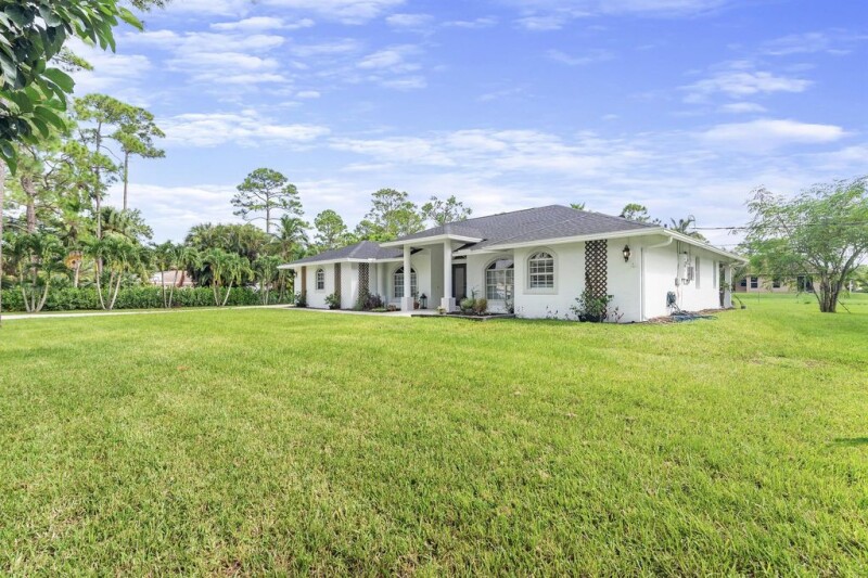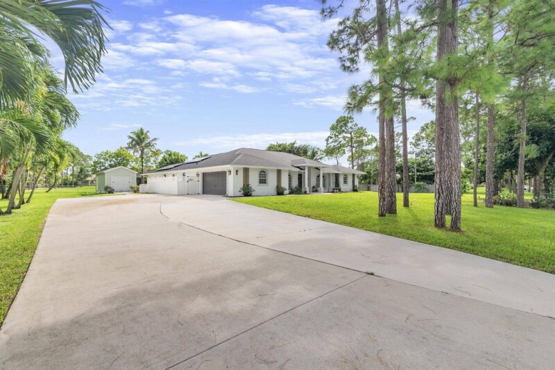 Welcome to your Dream Home! This beautifully renovated 5-bedroom, 3-bathroom property offers modern luxury and country charm, featuring a NEW ROOF. Located in The Acreage, just 2 minutes from Avenir Town Center on a paved road with NO HOA. Inside, enjoy vaulted ceilings, an open floor plan, and a gourmet kitchen with granite countertops, an 11-foot island, and stainless steel appliances. The master suite includes custom closets, a soaking tub, and patio access. Spacious secondary bedrooms feature walk-in closets. The large yard has tropical fruit trees, space for a pool, RV, and boat parking. Additional perks: fiber internet, energy-efficient lighting, built-in ice maker, solar system, and filtration system.