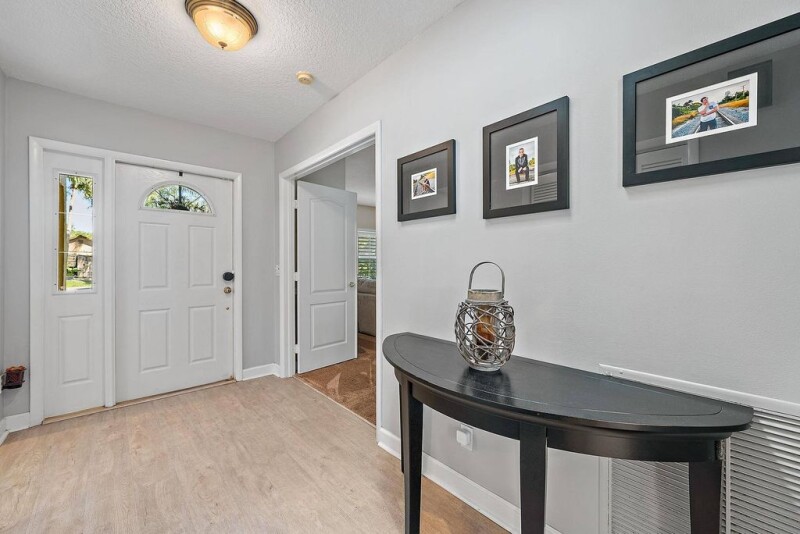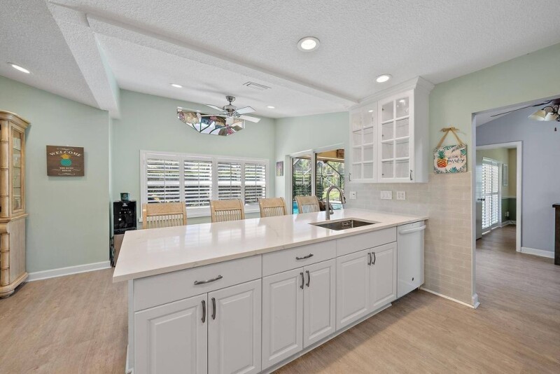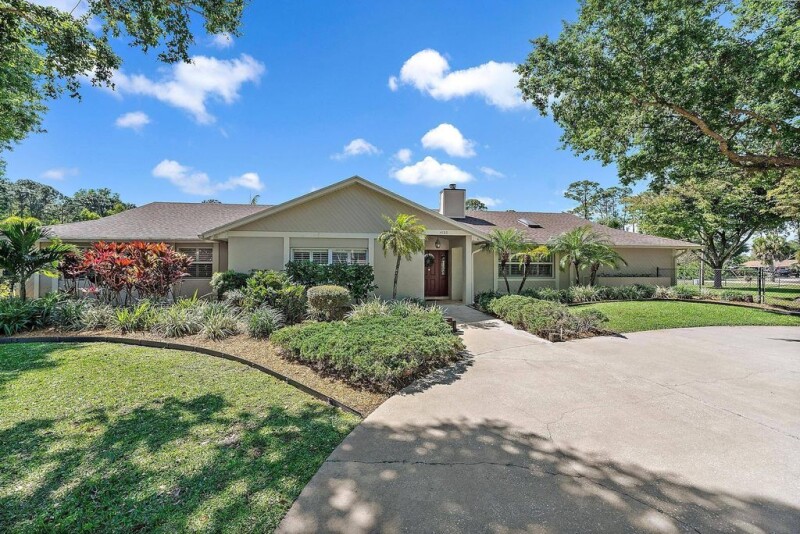 Country living in paradise! This 1 story 4 bedroom/3 bath ranch style home sits on a beautifully landscaped + fenced 1.25 acre lot. There is abundant parking with a front entry circular drive, a 3 car side entry garage plus a pad for your RV, boat + more. Enjoy a fully renovated kitchen with white shaker wood cabinetry, quartz countertops + glass backsplash. The kitchen opens to a spacious dining room with room for 8. The home is fully protected with impact windows, doors + skylights + new roof installed in 2019. There are 2 master ensuites, one being used as a den, 2 secondary bedrooms w/shared bath + a cozy living room w/ floor to ceiling wood burning stone faced fireplace. Relax on your screened patio which overlooks the 10' deep saltwater pool + large green space. New AC's (2022).