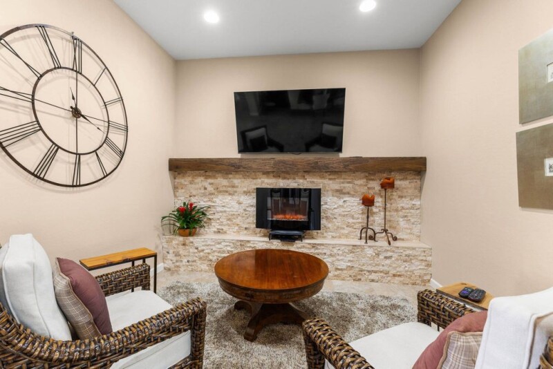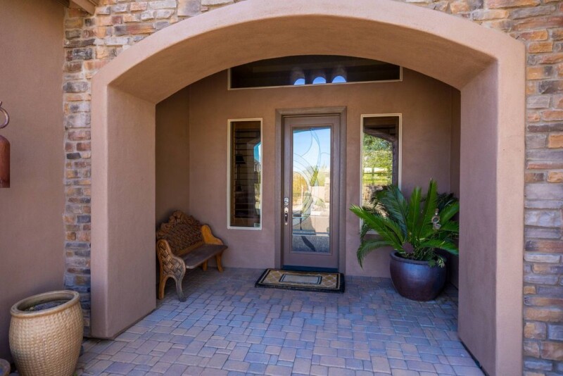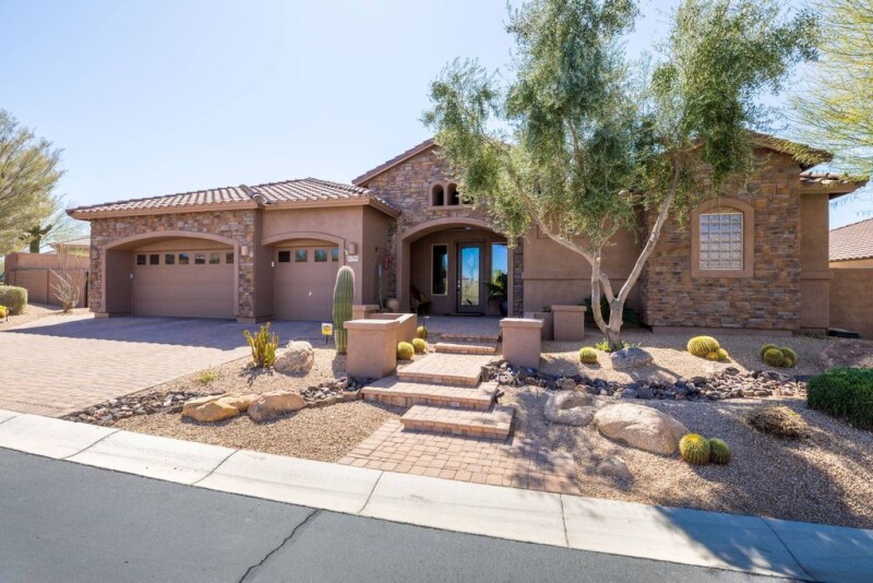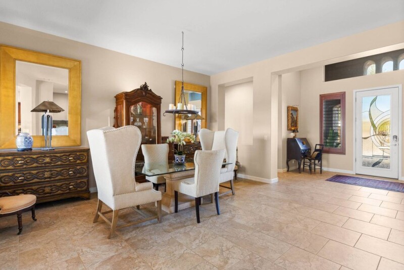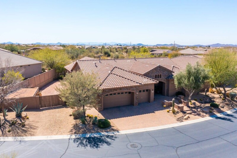 Nestled within the sought-after Lone Mountain community, this exceptional 4-bedroom, 3-bath residence showcases the neighborhood's beloved Torrey Pines open-concept floor plan. Designed for effortless living and entertaining, the home features numerous upgrades, including recent Pergo wood flooring throughout and designer window treatments. The chef's kitchen is a true centerpiece, equipped with GE Monogram appliances, a gas cooktop with built-in wok station, custom roll-out shelving, a wine fridge, and elegant pendant lighting. The expansive eat-in kitchen offers an extended counter-height breakfast bar and ample space for a dining table. Flooded with natural light, the great room boasts built-in wood cabinetry and two walls of windows framing serene desert views. Paver stone walkway leads to stained glass front door; den with custom stacked stone wall is warm and inviting, with adjacent formal dining area. Split floor plan ensures privacy, with the primary suite offering a tranquil retreat, large bathroom with two closets, separate vanities and soaking tub/walk-in shower, while two guest bedrooms share a well-appointed bath. A fourth bedroom/home office is tucked toward the back, conveniently located near a third full bathroom and exterior access. Situated on an expansive 13,000 SF lot, the low-maintenance backyard is perfect for relaxation and entertaining, featuring a cozy gas fireplace, tranquil fountain, paver stones, xeriscaping, and a garden planter. Additional highlights include a metal storage shed on the west side, a spacious site-built workshop with electricity on the east side, and an RV gate with ample space for a boat or trailer, provided they remain below the fence line. This exceptional home blends comfort, style, and functionality in one of Lone Mountain's most desirable private gated enclaves, which includes many community parks with play fields, playgrounds, basketball courts, ramadas, and desert gardens.