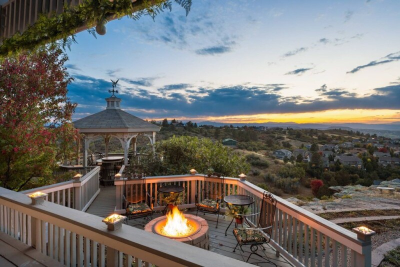 2874 Cliff View Court is a once in a lifetime estate set on an extraordinary lot situated above Castle Rock with unobstructed views from Pikes Peak to Longs Peak. It’s brimming with exclusive features and hidden treasures, offering unparalleled amenities found nowhere else in Douglas County. The secluded lot has rare adjacent acres of open space and trails. The double-level deck includes a covered upper portion with an automatic awning. The lower deck has a gas fire pit and an outdoor kitchen next to a cascading 6-waterfall feature overlooking a 4-tiered irrigated flower garden. A bridge from the lower deck leads to a secluded covered gazebo. From there, you look down on a circular fire pit in a stunning natural rock formation, perfect for entertaining and mountain-view evenings under the stars. Further below is a sunset grotto for spectacular, secluded twilight afterglow views. Inside, an aspen foyer leads to a beautiful formal dining room with custom wall treatments and a coffered ceiling. Adjacent is a bonus office space. The kitchen and breakfast nook feature granite countertops, dual islands, and custom cabinetry seamlessly flowing into the great room with a stone fireplace, recessed lighting, and floor-to-ceiling windows showcasing the awe-inspiring views. The main level primary suite includes a spa-like en suite bathroom with dual vanities, Jacuzzi tub, and refined finishes. The upper level offers a versatile loft / media room with a built-in bar, 2 additional bedrooms, an office, and a full bathroom. The lower level beckons with an Italian-inspired stairwell leading to a whimsical Victorian playhouse, a large bedroom, ¾ bathroom, and ample storage. The 3-car garage, custom window treatments, extensive crown moldings, and hardwood floors further elevate this unrivaled retreat. Put simply, this residence is a home unlike any other you'll find — for one lucky buyer, it's a rare Castle Rock sanctuary of exceptional beauty and endless discovery.