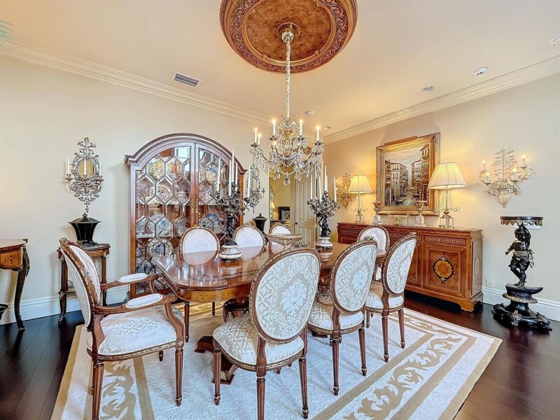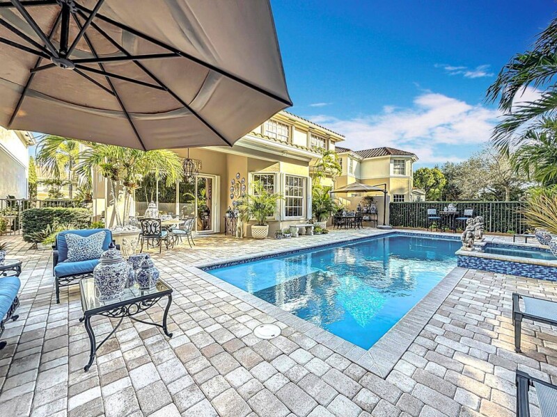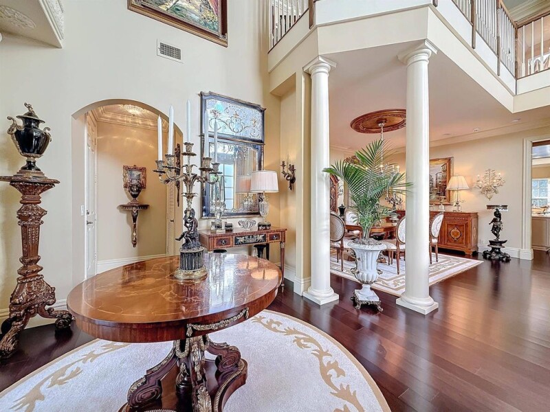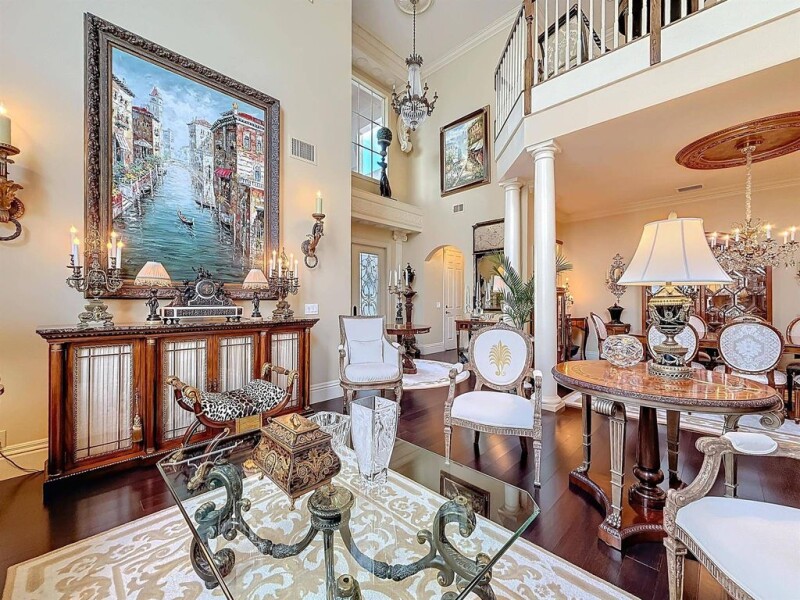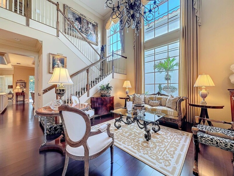 From the moment you step foot into this home, you immediately get a sense of its grandeur. 21 ft ceilings from the foyer & living room opening up to the 2nd story with floor-to-ceiling windows. The gourmet kitchen is completely custom: built-in appliances, induction cooktop, soft-close cabinets & drawers wrapping the entire island & base, stacked to the ceiling. The convenience of the master & guest bedrooms downstairs, with 4 bedrooms situated upstairs around the central loft gives this home a perfect flow. The attention to detail in the custom woodwork & trim carpentry is unlike any other home in this manned gated community. Meticulous care went into designing the landscaping and reimagining the pool & backyard into its own private resort.