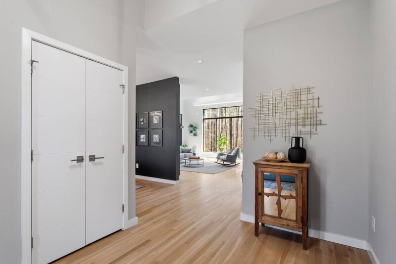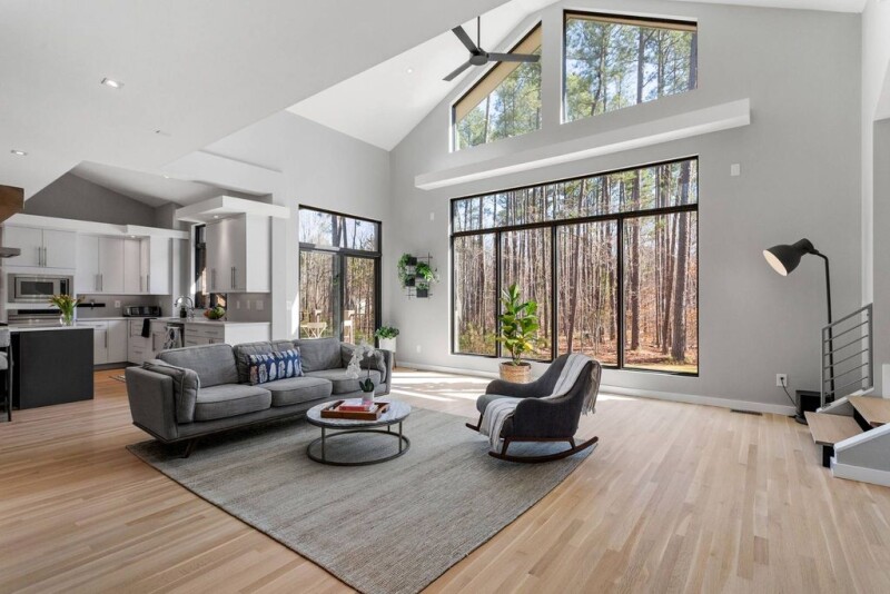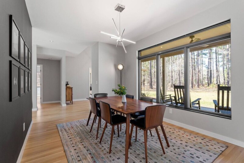 Enjoy modern design and tranquil living in this stunning 2020-built home on two private acres, just moments from the incredible 14,000-acre Jordan Lake. Designed with soaring ceilings and a minimalist aesthetic, this home offers an expansive open floor plan filled with natural light. The sleek, minimalist design features site-finished rift and quarter-sawn white oak floors, solid-core doors, LED lighting throughout, a walk-in pantry, quartz countertops, Dacor 6-burner range top, Thermador dishwasher, sealed crawl space, spray foam insulation, two EV chargers, and more. Need a fourth bedroom? Chatham County recently approved a new operations permit classifying this 3-bedroom with study to a 4-bedroom. Located in a small, peaceful, community with large lots, no HOA fees, and an easy 15-minute drive to UNC/downtown Chapel Hill, Southpoint Mall, and Pittsboro, and 25 minutes to Duke. Whether relaxing or working from home, you can enjoy hyper-gig internet courtesy of AT&T Fiber (1 Gbps) and CAT6 cable is hardwired in every room for those who may need it. Time to play? This serene retreat has numerous sporting activities nearby including golfing at Governors Club, (membership required) and The Preserve at Jordan Lake; fishing at Rock Quarry Fishing Pond; or go all out - fish, boat, swim, picnic, and/or build sand castles at one of the beautiful beaches, or hike and cycle the trails at Jordan Lake State Recreation Area. It's the ideal home for an idyllic life!.
