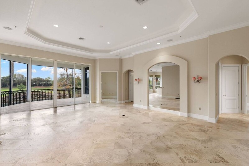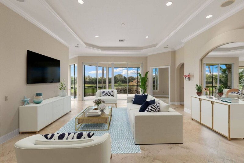 Welcome to this elegant residence boasting three bedrooms, three baths plus a den. Upon entering through the double doors, you're greeted by a grand staircase leading to an expansive great room with breathtaking views of the golf course. The open floor plan creates a warm and inviting atmosphere, accentuated by stunning stone floors throughout the main areas. The kitchen is a chef's delight with beautiful cabinetry, high-end appliances and gas cooking. Retreat to the luxurious primary suite featuring dual vanities, a generous soaking tub and a frameless glass shower door. Immerse yourself in natural light and stunning southern exposure views from your screened-in balcony. High ceilings add to the sense of space and grandeur. Virtual photos show how the home can be recreated to fit your needs. In the award-winning community of Mediterra featuring two Tom Fazio championship golf courses, pickleball, tennis, state-of-the-art fitness and a private beach club. Enjoy your toes in the sand and golden sunsets at Mediterra's fully renovated private Beach Club, along the Gulf. Imagine arriving to have your car valet parked and lounge chairs and umbrellas waiting for your arrival or set up upon your request. With 10,000 square feet of space, the upper level offers indoor and alfresco dining, a full bar, swimming pool along with lockers and dressing areas for changing. Spend the day and enjoy dinner while watching the sun set in the distance.
