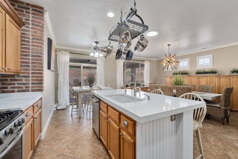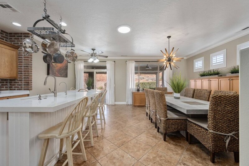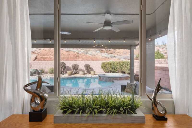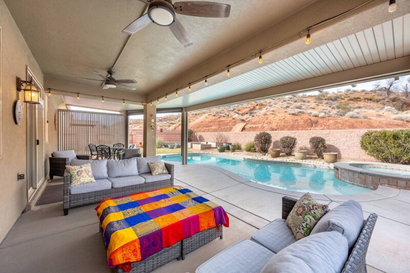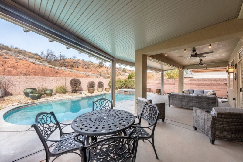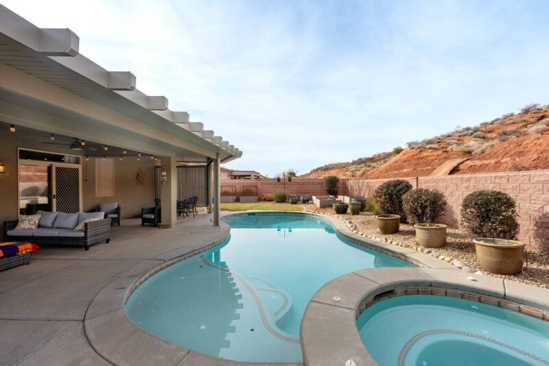 This stunning 4-bedroom, 2-bathroom home offers a perfect combination of modern comfort and timeless style. The interior boasts quartz countertops in the kitchen, elegant plantation shutters, and an open floor plan filled with natural light. The oversized primary suite provides a relaxing retreat, while the additional bedrooms offer flexibility for family, guests, or a home office. The private backyard is an entertainer's dream, featuring a sparkling pool and spa, a covered patio. A 3-car garage ensures ample storage and parking. A furniture package is available for a seamless move-in experience. Situated in a sought-after, established neighborhood, the community offers incredible amenities, including indoor and outdoor swimming pools, a clubhouse, an exercise room, pickleball, and tennis courts—perfect for active living. Just minutes away from Coral Canyon Golf Course and numerous other golf courses in Southern Utah, this area offers a wealth of activities to enjoy including hiking, biking and off-roading trails. Explore the renowned Tuacahn Amphitheatre, the stunning Snow Canyon State Park, and the beautiful Sand Hollow Reservoir, among many other attractions. Don’t miss this opportunity to live in a home that blends exceptional features with resort-style community amenities. Schedule your private tour today!.