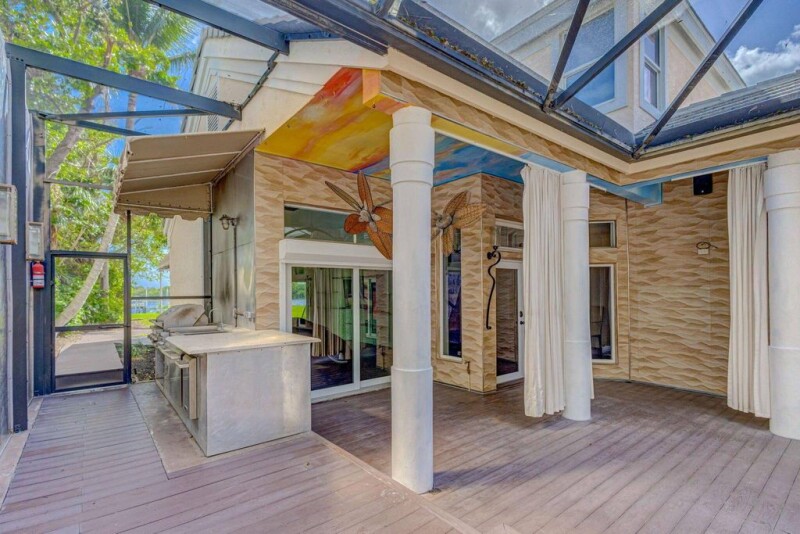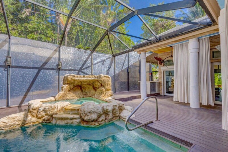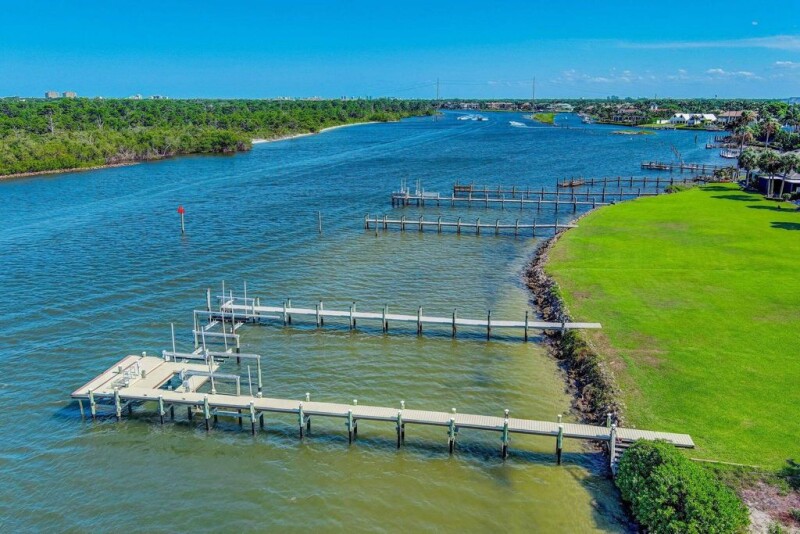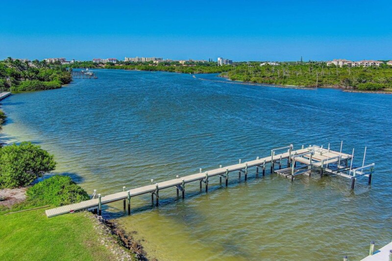 This absolutely stunning WATERFRONT courtyard home sits directly on the Intracoastal! Includes Private DOCK w/ water & electric,16,000lb lift + more space to tie up, 2 jet ski lifts & private stairs to beach! Home features include ROOF 2019, Impact windows & doors, separate guest house with bath & kitchenette, screened courtyard with heated pool/waterfall spa & a summer kitchen. The first floor of the home features high ceilings, big windows with incredible Intracoastal views, a spacious kitchen & family room that opens to the pool and the stunning primary suite with it's own access to the patio and water views. Both bedrooms upstairs have private baths, one with water views. Sprawling rear greenspace leads to the water. Amazing community with club memberships available but NOT required.