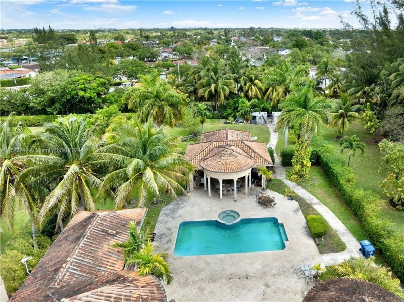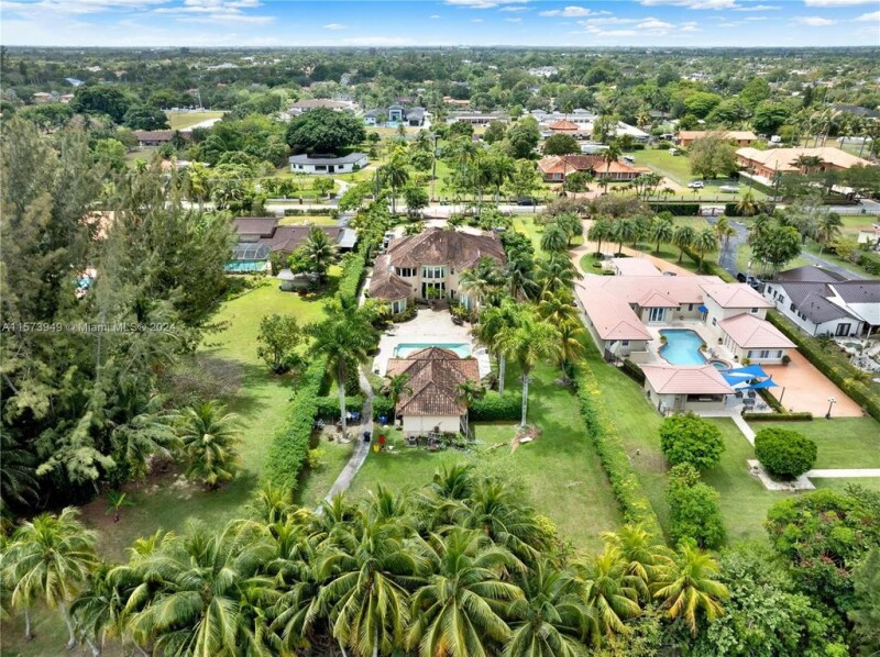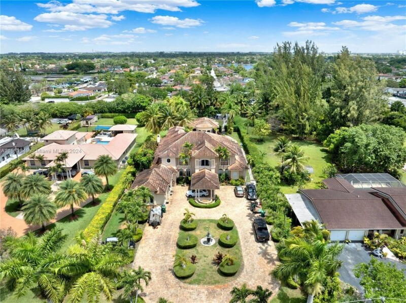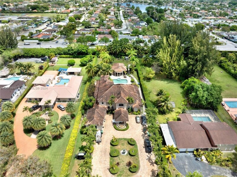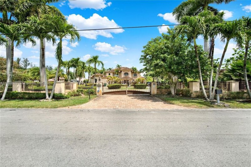 This custom-built home spans an impressive floor plan of 9,421 total s/f and includes a convenient elevator for easy access to all levels. Upon arrival, you're greeted by an elegant gated entry leading to a sprawling circular driveway, porte-cochere, and a spacious 3-car garage. The main residence boasts 6 bedrooms and 5.5 bathrooms, with an additional 1 bedroom and 1 bathroom in the expansive guest house/gazebo. Inside, the home exudes luxury with a family room, recreational room opening to a large balcony, and a gourmet kitchen featuring high-end stainless steel appliances and a center island perfect for culinary enthusiasts. Throughout the home, you'll find travertine marble floors, high ceilings, and high-quality impact windows.
