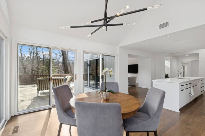 This stunning contemporary home blends expansive, open living spaces with intimate retreats, offering breathtaking views of a surrounding ravine. Abundant windows invite natural light and frame the serene landscape. The chef's kitchen features custom cabinetry, a large quartz island, and high-end appliances (Wolf, Miele, Subzero), while the breakfast nook opens onto an expansive deck. The main level includes a private primary suite with a spa-like bath, a luxurious walk-in closet, a library with a fireplace, a vaulted dining room, and a custom pantry. Upstairs are two spacious en-suite bedrooms with walk-in closets. The finished lower level offers a rec room, office/bedroom, full bath, and ample storage. Set on nearly an acre of professionally landscaped grounds, this rare gem provides unmatched privacy in an ideal location. A true sanctuary blending style and comfort.