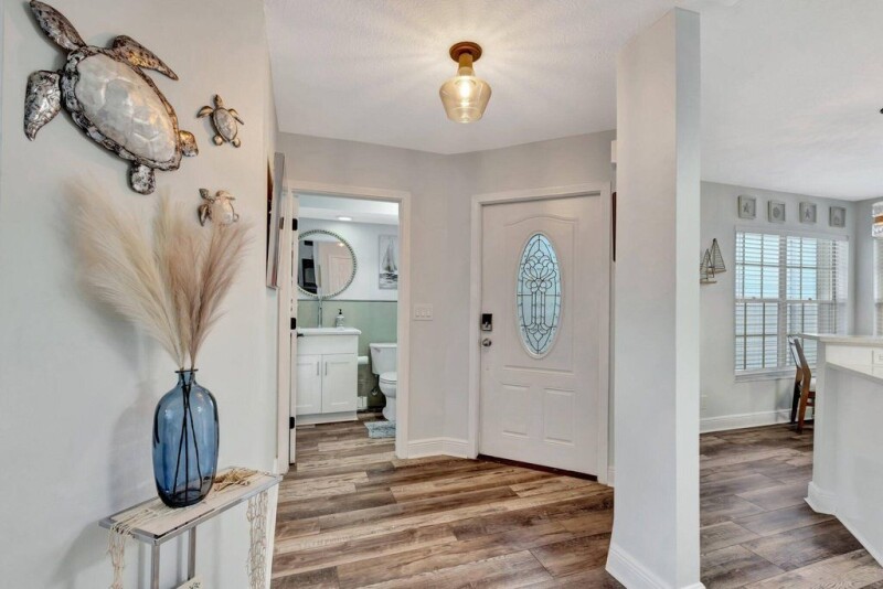 FULLY FURNISHED/TURN-KEY beautifully updated 3 bedroom 2 bath beach townhouse in gated Ocean Dunes in Jupiter! Updated kitchen with white quartz counters and stainless appliances, updated baths, walk-in closets, sitting area in upstairs bedroom, covered screened patio space, open patio, and balcony. Wood-like luxury vinyl floors throughout. Largest floor plan in Ocean Dunes. 2 assigned parking spaces, laundry in unit. This is a 2 story townhouse with stairs but Primary bedroom is on the ground floor with 2 large guest bedrooms upstairs. Volume ceilings with loft area. Community offers pool that overlooks the lake, tennis courts, pickle ball, basketball, and more. Walk to the beach! Come see it today!.
