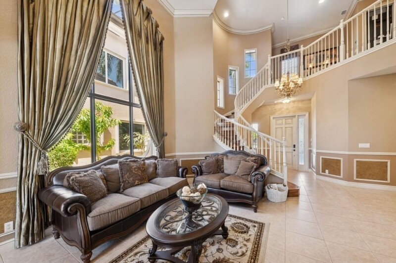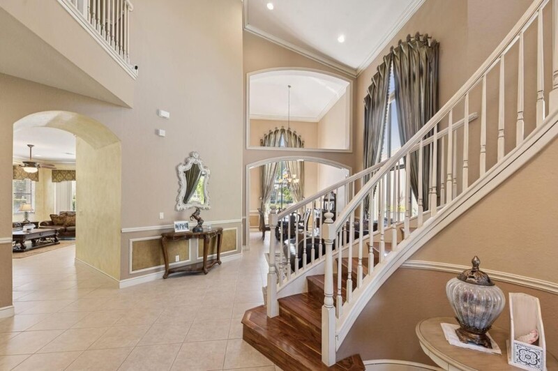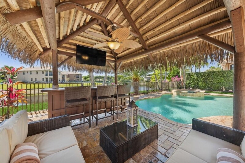 This exquisite 5BR/4.5BA/3CG lakefront pool home is located in the prestigious Versailles community in Wellington, FL. With its impressive two-story design & fabulous outdoor oasis, this estate offers a perfect blend of elegance, comfort & modern convenience. The interior is nothing short of stunning. From custom paint to elegant millwork, every detail has been thoughtfully curated. There's a formal LR, DR & FR so everyone can enjoy their own space & one ensuite BR down w/cabana bath. Step outside to your private tropical retreat, where your saltwater heated pool w/ raised spa awaits, surrounded by a stunning travertine deck & beautifully updated tiki hut w/ cable-ready mounted TV, which now features synthetic thatch that is hurricane rated, bug & fire-resistant--perfect for quiet evenings.