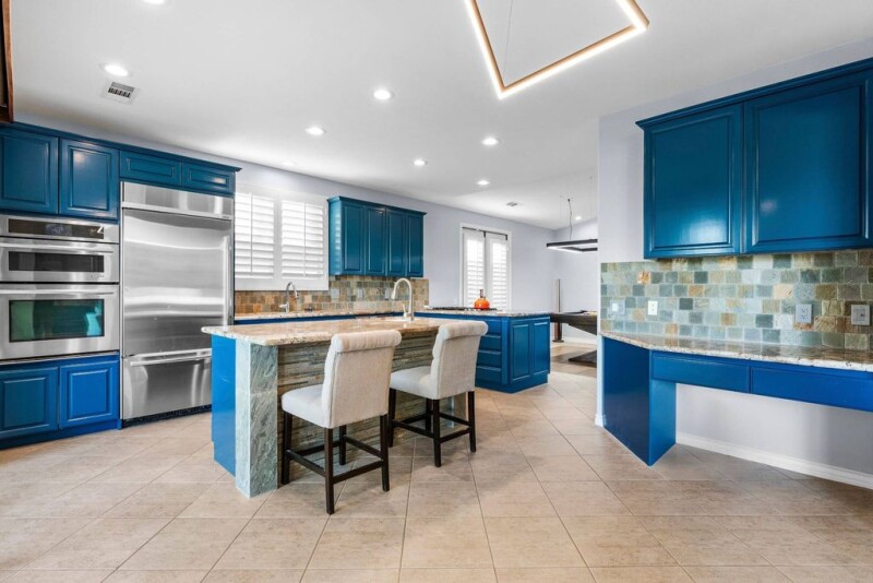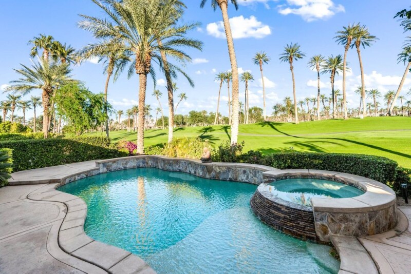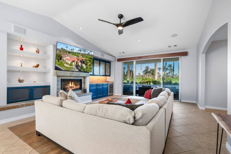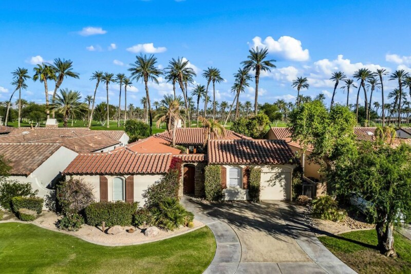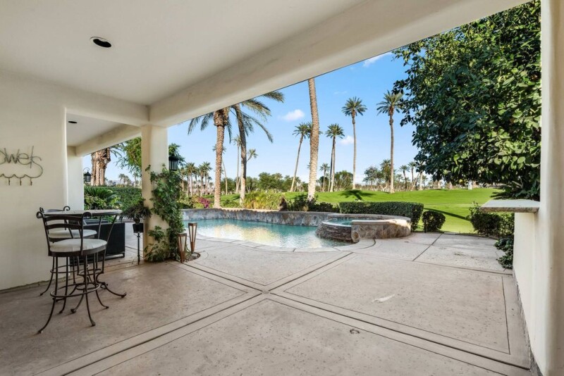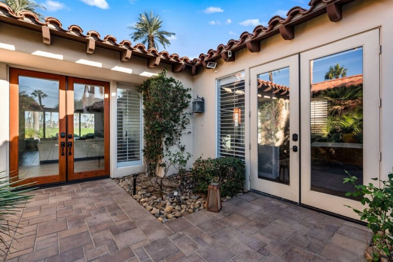Set on the 10th fairway of the Fred Couples-designed Palms Golf Course, this Mediterranean-inspired masterpiece offers over 3,100 sq. ft. of luxurious living space. With 4 bedrooms and 3.5 baths, the main home includes 3 bedrooms (with an office that can double as a 3rd bedroom), while the detached casita provides a private 4th bedroom—ideal for guests. A private gated courtyard with an outdoor fireplace and fountain welcomes you to this stunning home. Dual glass doors open to reveal breathtaking views of the fairway, framed by towering palms and offering spectacular sunrises and sunsets. Inside, custom wood tile inlay flooring, a dramatic stone fireplace, and high-end finishes create an inviting and sophisticated atmosphere. The expansive chef's kitchen features two granite islands, Jenn Air appliances, and ample storage, perfect for entertaining. The master suite, located for privacy, offers a luxurious bath with a custom walk-in shower, spa tub, and designer finishes. Two additional guest rooms provide comfort and seclusion. The outdoor space is an entertainer's dream, complete with a built-in BBQ, pool, heated spa, surround sound, and sweeping golf course views. Located in the renowned Palms Golf Club, known for its exceptional value and no tee time policy, with low HOA fees and access to golf, tennis, dining, and outdoor activities.