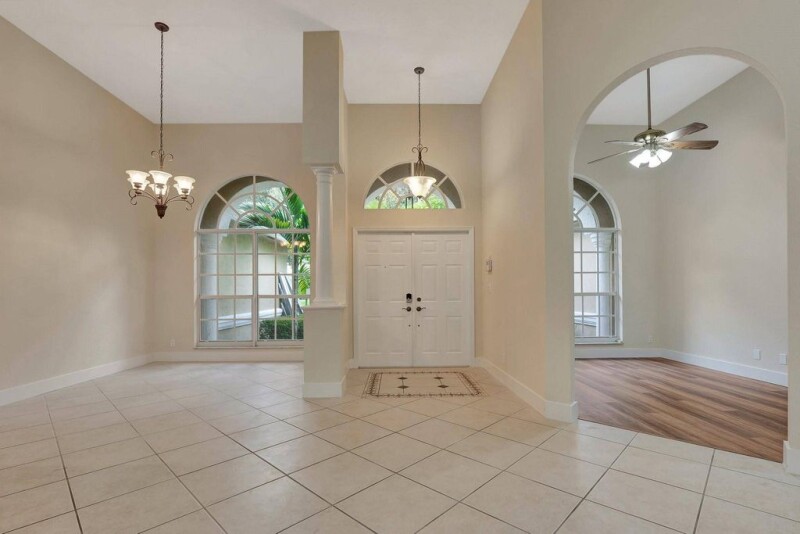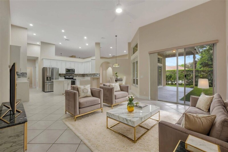 Triple split 4 bedrooms, office OR 5th bedroom, 3 baths, 2 car garage. Soaring volume ceilings tiled floors, with arched windows that flood the space with natural light. The fresh paint inside and out gives it a crisp, new feel. The master suite is a dream, featuring new flooring, a spa-like ensuite with a luxurious shower, separate tub, and dual vanities. The heart of the home is an open kitchen that flows seamlessly into the family room, quartz countertops, breakfast bar and stainless steel appliances. Freshly painted! The garage shines with a new epoxy finish, and there's even floored attic space for all your storage needs. BEST FLOOR PLAN! Nestled in a secure, gated community, this gem comes with a low HOA fee of just $390 per quarter. Convenient location near shops, sawgrass expwy.