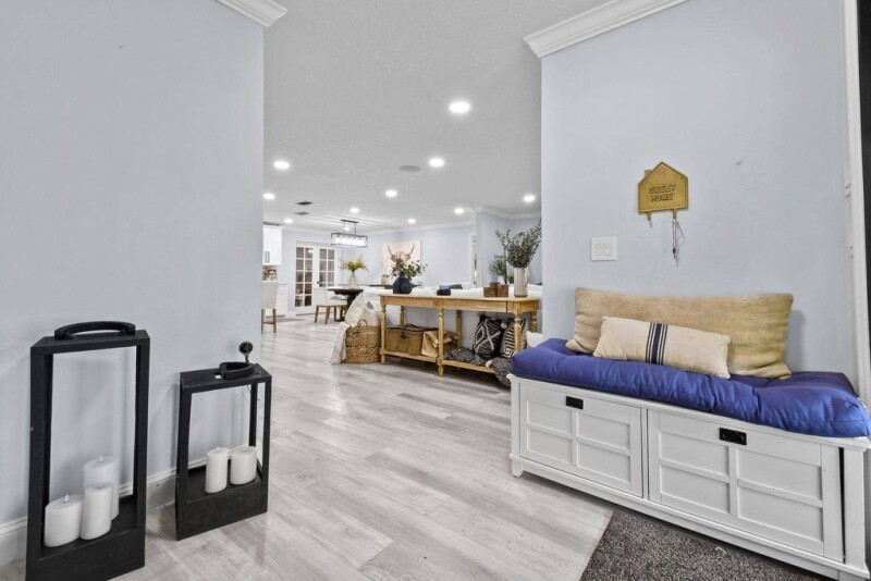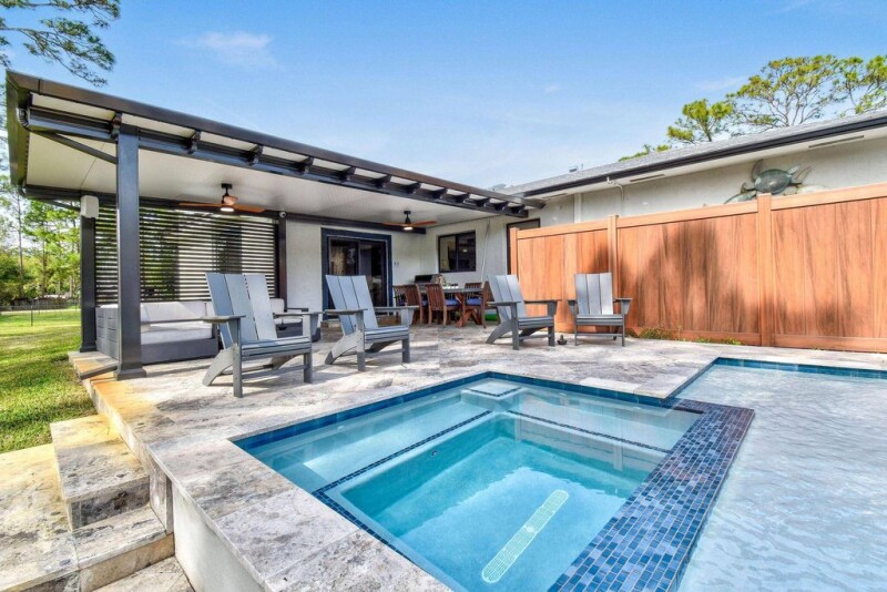 Modern farmhouse ranch style home on 1.2 acre corner lot-newly renovated. New roof 2023, 2023 drain field and new hurricane impact glass 2023 throughout home. The open split floor plan boasts Calcutta quartz countertops and new cabinetry. New appliances, beautiful crown molding and a walk-in pantry. There is a spacious bonus room which can be used as a bedroom, or game room; has a separate entrance leading to the 2024 heated saltwater pool and hot tub. New water softening system, new indoor and outdoor surround sound; 2024 pergola for entertaining or relaxation. New mounted outdoor cameras.Garage 2024 with electric car charging station.