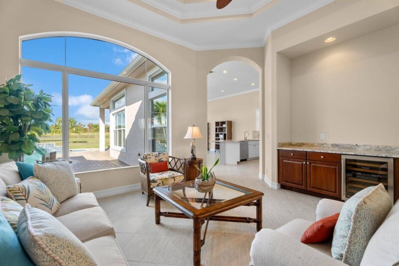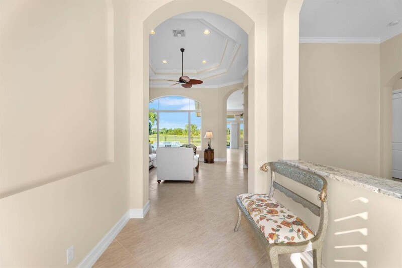 Rare best-selling extended Castania model and largest one-story on the market!!Prepare to be captivated by this exquisite residence in Jupiter Country Club, set against the backdrop of breathtaking golf and lake views.As you step into this remarkable home, you'll be greeted by an elegant seating room designed for entertaining with large open windows and the backyard as your conversation piece. The well-appointed gourmet kitchen leaves no detail overlooked featuring a hooded gas range, custom backsplash, center island, and spacious pantry. The cabinets were just painted white. This culinary haven is perfectly complemented by a sunlit breakfast area and an expansive family room. Sliding glass doors seamlessly connect the indoor and outdoor living spaces, providing direct access to the.