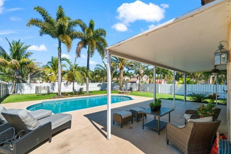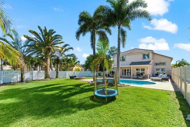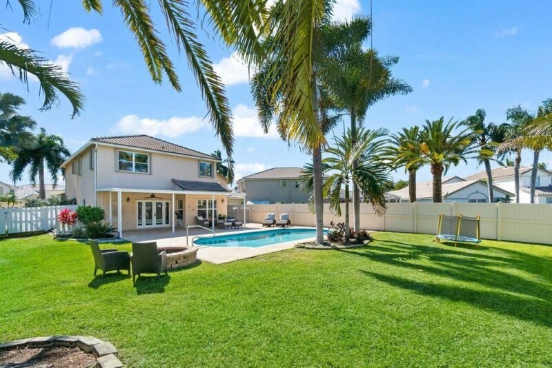 This stunning 4-bedroom, 3-bathroom home won't be on the market for long! Nestled in a cul-de-sac in The Reef of Lake Charleston, it sits on a large .23 acre fenced corner lot, complete with a sparkling pool, beautiful palm trees and a covered patio, perfect for year-round outdoor enjoyment. Inside, the thoughtfully designed layout includes a full bedroom and bathroom on the first floor. The kitchen features stainless steel appliances, sleek white cabinetry, an island, a pantry, and a cozy eat-in area that seamlessly flows into the spacious family room, offering picturesque views of the backyard oasis. Luxury vinyl plank flooring runs throughout, complemented by elegant crown and decorative molding. The home is fully protected with impact glass and accordion shutters for peace of mind.