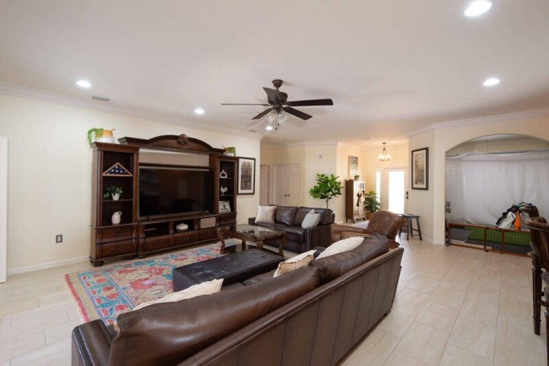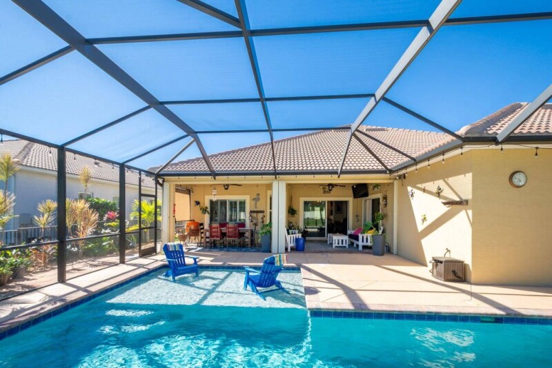 Stunning waterfront pool home in The Estates at Tradition! This 4-bedroom, 3-bathroom home offers over 3,400 sq. ft. of living space and a spacious den. The primary suite boasts a spacious sitting area, 2 large walk-in closets and a luxurious en-suite bath. The gourmet kitchen features 42" cabinets, stainless steel appliances, granite countertops, and a large pantry with custom doors. Additional interior highlights include a custom wet bar, wood accent wall, plantation shutters, crown molding, and wood-like tile floors. Enjoy the expansive screened-in patio and salt-water heated pool, perfect for outdoor living. Tradition in Port St. Lucie offers a vibrant mix of shops, restaurants, and entertainment. Enjoy scenic parks, walking trails, a golf course, and regular community events.
