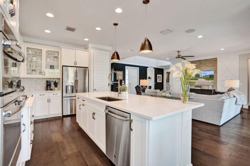 Fully upgraded & finely finished, builder ''model'' home with 5 bedrooms, 4 bathrooms, a loft and 3 car garage. An awesome chef's kitchen has quartz counters, designer cabinets, S/S appliances, custom wine fridge, & a gas stove that overlook the family room & large eat-in kitchen nook area. Enjoy the split bedroom floor plan & picturesque lake views from the 2 primary suites (one up-stairs & another down), family room & kitchen nook. There are fabulous designer accent walls, 9 foot doors, upscale stair railings & coordinated window dressings that contribute to the elegance of this fine Kennedy built, designer home. The living area flows easily from room to room for entertaining & relaxed living. Experience the convenience, safety & security of all impact windows & doors. Ride the included.