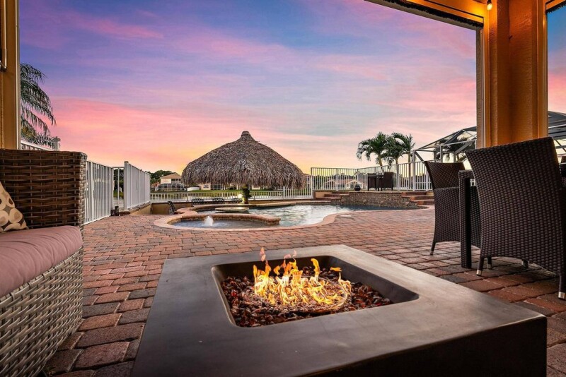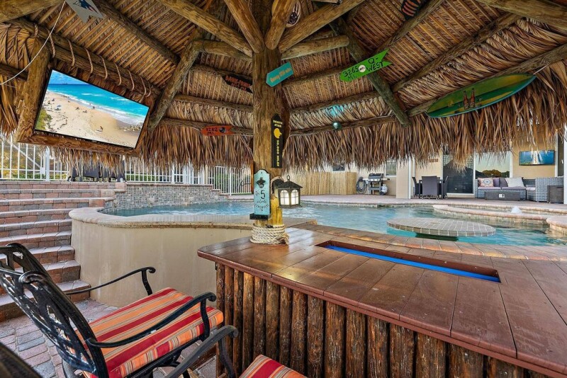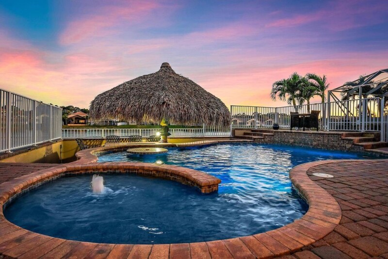 Imagine a stunning waterfront tropical oasis in Stuart, Florida. River Marina is located off the St. Lucie River with a boat ramp and ocean access. This breathtaking home sits on the lake, offering serene water views from nearly every angle of the backyard. Step outside & you'll be greeted by a resort-style saltwater pool with built-in bar. The perfect way to enjoy cocktails while keeping cool in the water. A variable-speed pump and pool heater ensure efficiency and year-round comfort. Just steps away, a newly re-thatched tiki hut provides a shaded retreat. The ideal setting to relax or entertain. The lush, meticulously landscaped grounds surround the property, with vibrant tropical vibes.