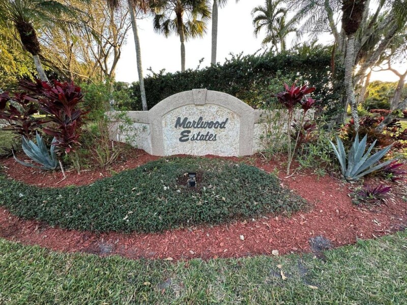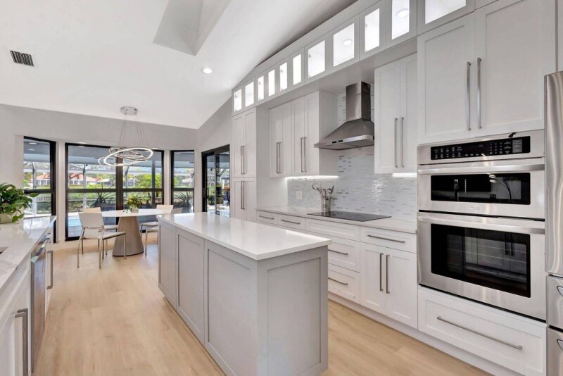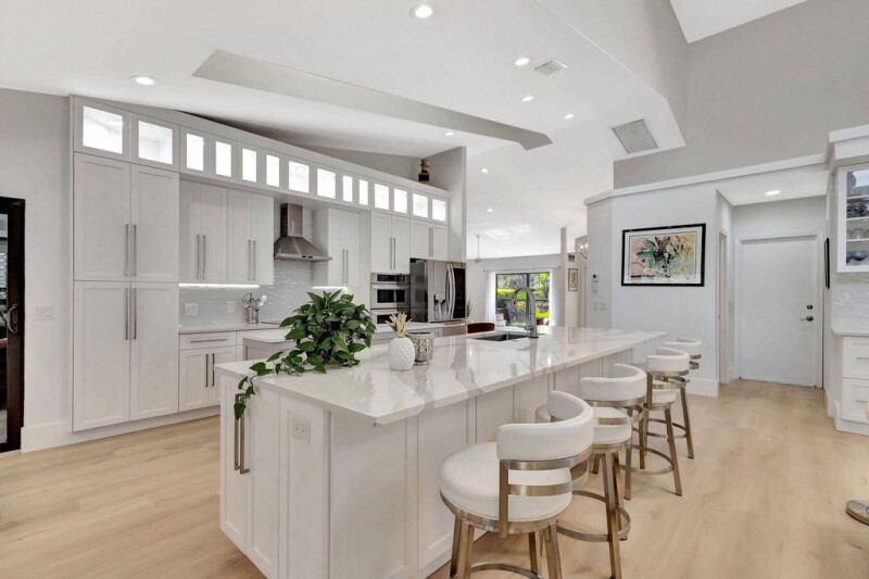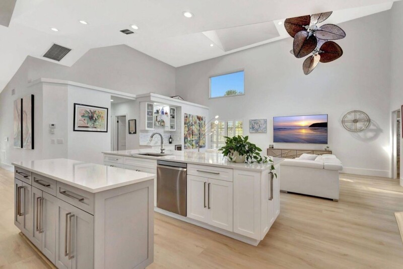 Totally renovated single story home in Marlwood Estates with split floor plan, open kitchen concept with 2 islands, private pool, 2023 concrete roof, plus golf and water views. Perfect for entertaining or relaxing outdoors with 902 sqft of patio under roof with tongue in groove ceiling, 4 fans, a skylight, and speakers. New travertine paver deck and screened in pool/patio enclosure. Fully fenced 0.3 acre lot with 8-car travertine driveway and 2-car garage with Tesla charger and attic storage. Kitchen is fully updated with tall white shaker cabinets and 2 islands, 1 with grey accent cabinets. Cambria stone quartz counters, tile backsplash, stainless steel appliances, deep sink, exhaust hood, and breakfast bar seating 4-5 stools. Windows are a majority impact and partial accordion shutters.