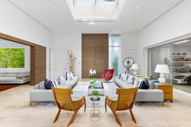 Stunning, custom contemporary home designed by award-winning architect Daniel Kahan of Smith and Moore Architecture. This home is an auto-enthusiasts dream property! This pristine 3 bedroom + den, 3.2 bathroom home is situated on a fantastic south side Sea Street lot in the center of town. Features fabulous 4-car garage and automobile showroom. Light filled formal living room with dramatic skylight overlooks the showroom with retractable blinds. Eat-in kitchen with expansive island, top-of-the-line appliances, walk-in pantry, and breakfast room. Beautiful primary suite with walk-in closet and primary bath with dual sinks and oversized shower. Expansive covered loggia and meticulously maintained grounds. No detail has been overlooked with pristine finishes and gorgeous marble and hardwood.