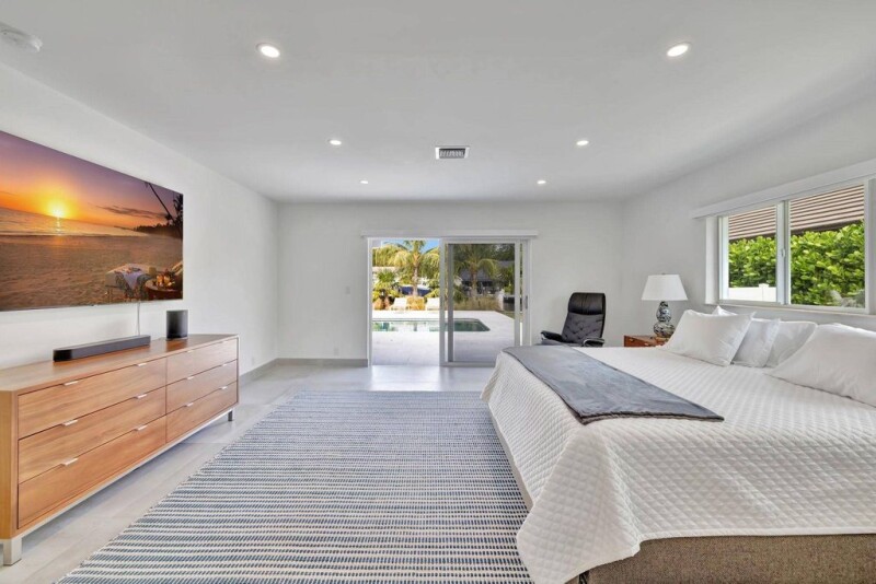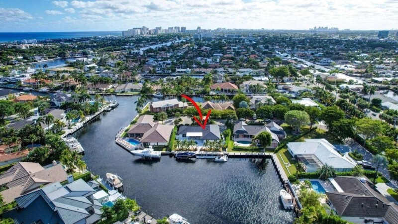 Located in Fort Lauderdale's premier 24/7 guard-gated deepwater community. Enjoy stunning simplicity & functionality. Custom sophisticated island-inspired single level residence. 2022 total renovation shows as NEW: metal roof, plumbing to street, all new electrical, air conditioners, tankless water heater & generator. Latest open concept living, great room, new Chef's kitchen, porcelain floor tiles, new impact glass & interior doors. Private Primary Suite, dual closets, new modern spa style bath, enclosed water closet, soaking tub & floating vanities. Split floorplan: 2 secondary bedroom suites, office (4th bed) + cabana bath. Most rooms access pool & wide-open turning basin views, incredible outdoor areas, 95 ft protected dockage. Perfectly located for Pine Crest & other A rated schools.