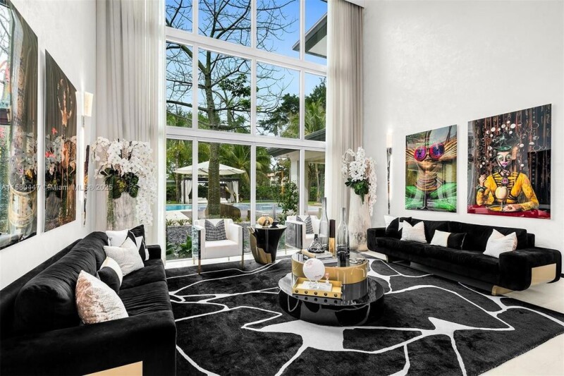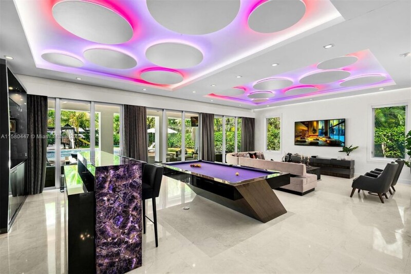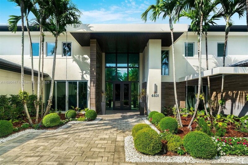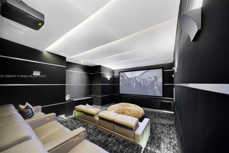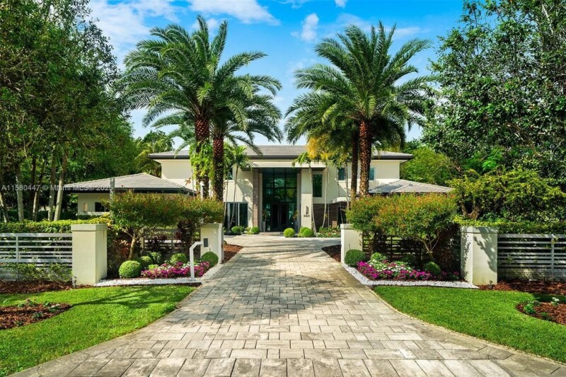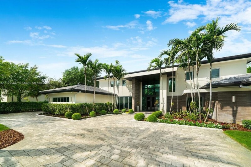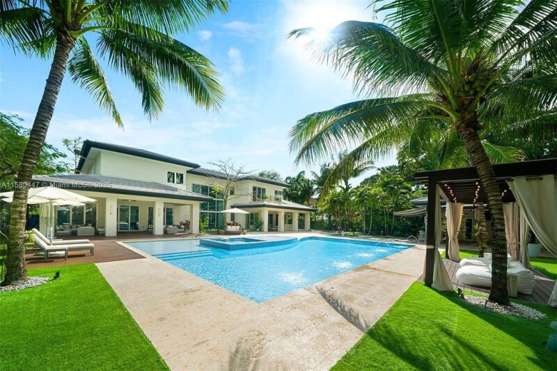 Welcome to this exquisite gated 2-story modern sanctuary. Cross the threshold and enter a world of luxury as you step through the grand foyer into a sprawling layout showcasing elegant formal living and dining areas, perfectly complemented by a spacious gourmet chef's kitchen. Ascend to an elevator to discover 4-suite bed rms, highlighted by a luxurious master suite featuring a sitting area, dual sinks, separate shower, and spa whirlpool, along with 2 walk-in closets and balcony access. Additional features include smart home features, entertainment area with a bar, wine cellar, home office, & home theater. Sliding doors lead to a tropical retreat, complete with a playground, mini golf area, 3 covered terraces furnished with seating, a separate guest house w/ a mini hair salon.